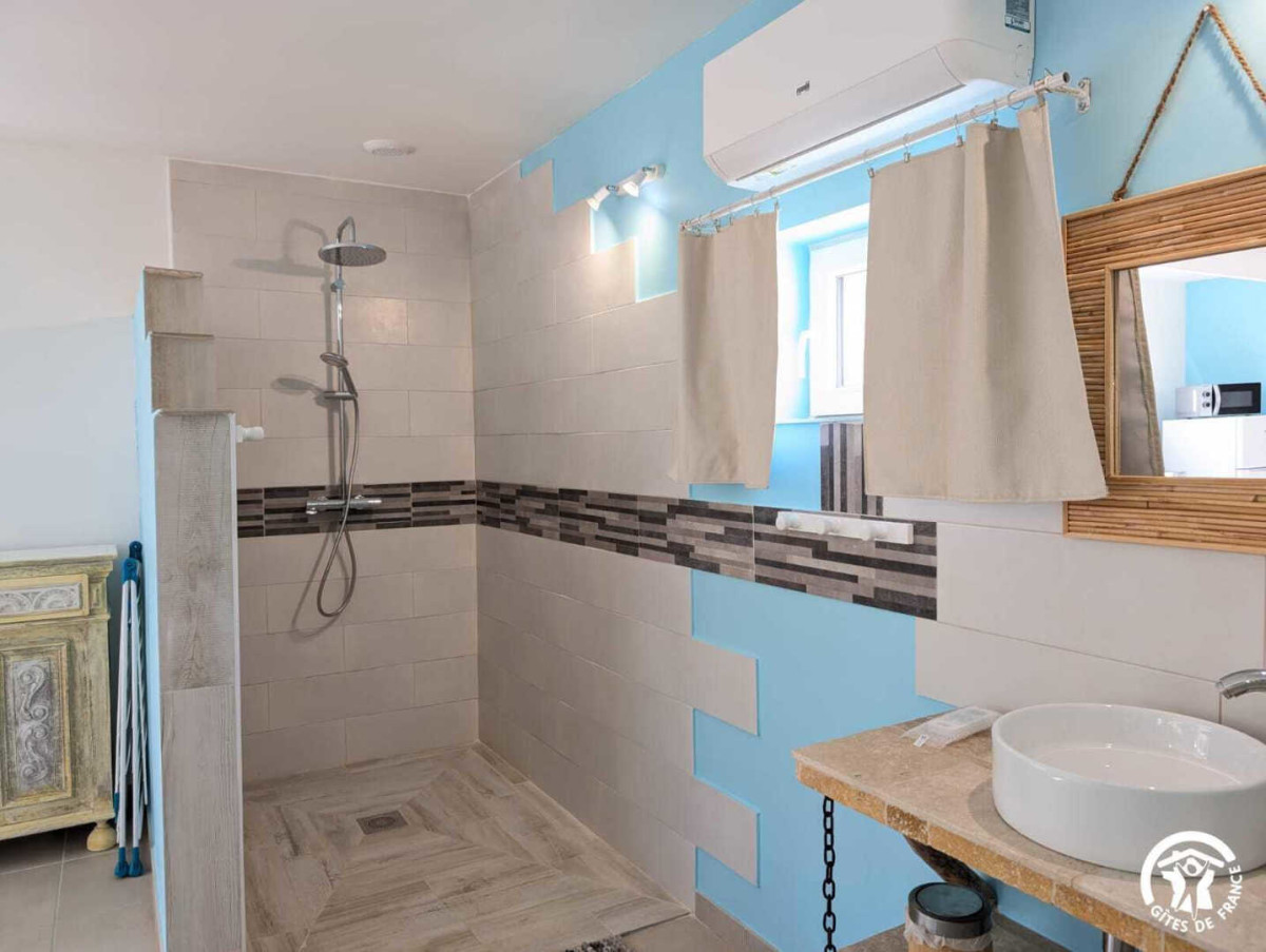 – Une salle d’eau ouverte avec une douche à l’italienne