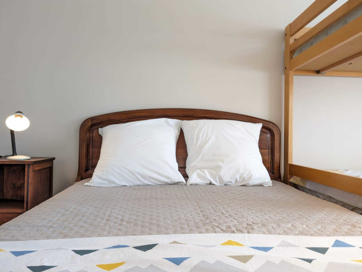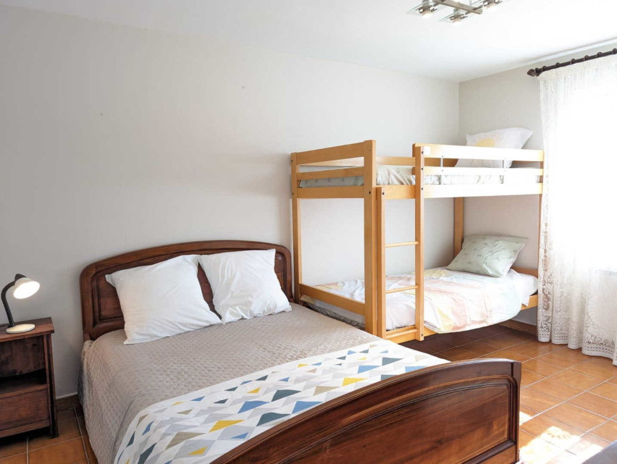 2 grandes chambres : la première dispose d’un lit double (140*190) et de rangements. La deuxième avec un lit double (140*190) et deux lits superposés (90*190), et rangements