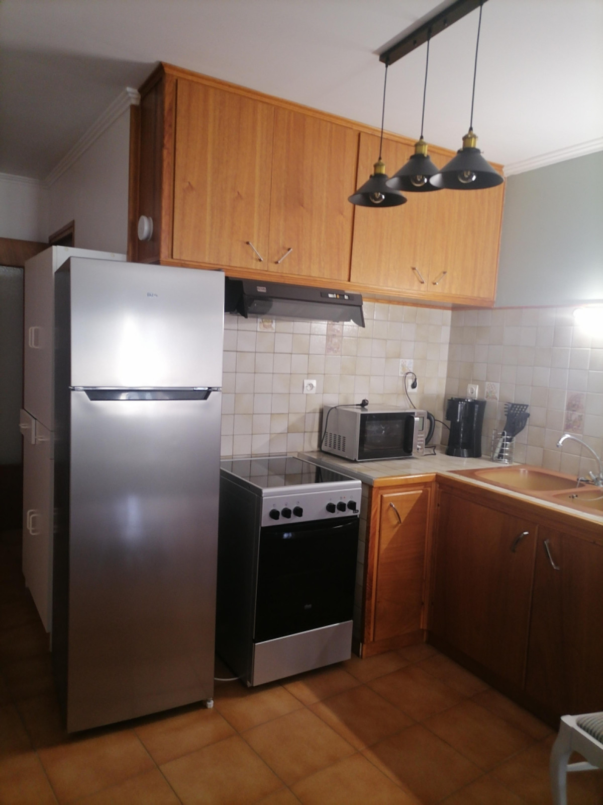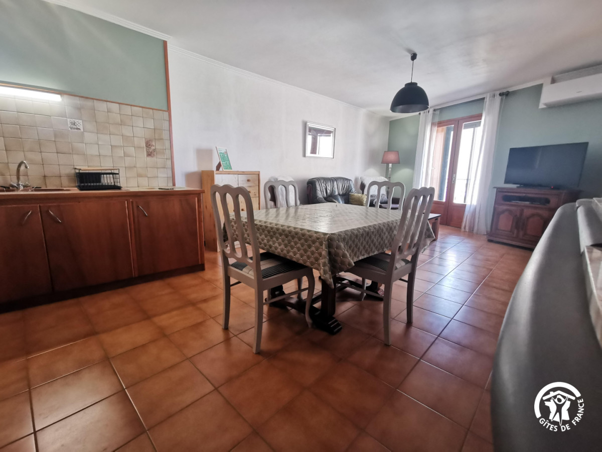 Au premier étage, vous aurez accès à l’hébergement composé d’un grand salon/séjour ouvert sur la cuisine équipée (gazinière, four, micro-ondes, cafetière, bouilloire..)