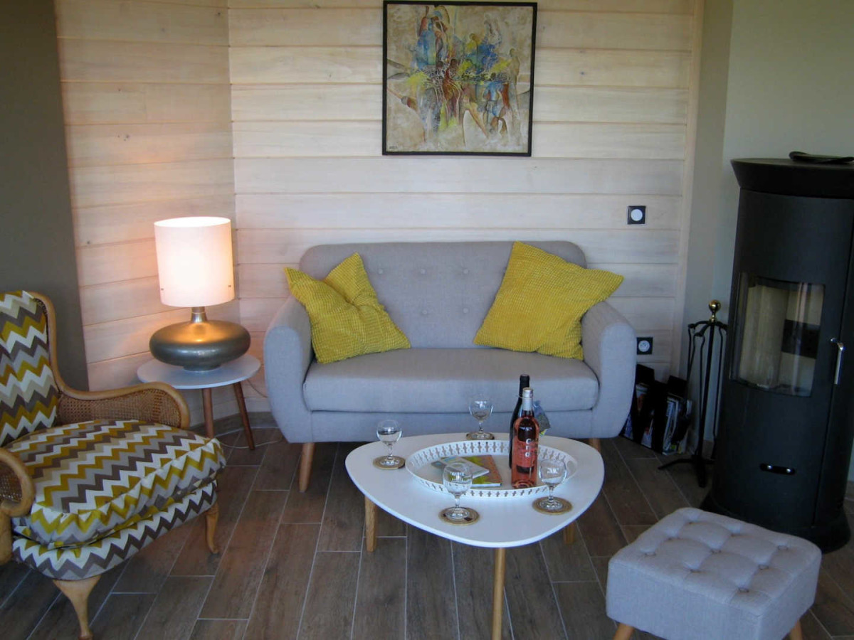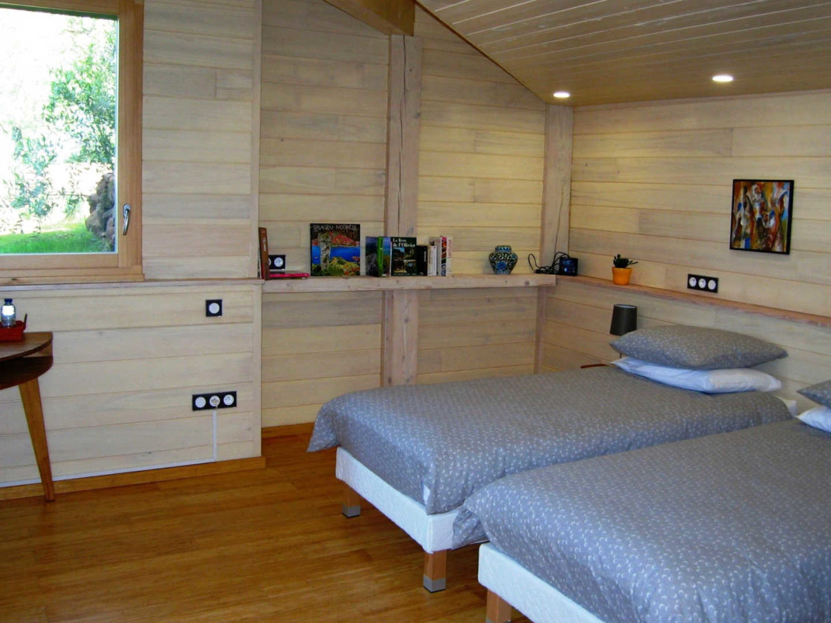 1er étage : 1 chambre ouvrant sur terrasse (2 lits 90X190cm modulables en 1 lit 180cm), coin toilette/wc, dressing, poêle à bois (fourni), TV,.