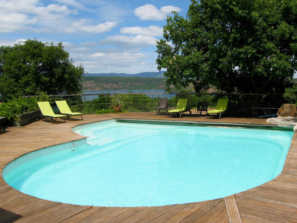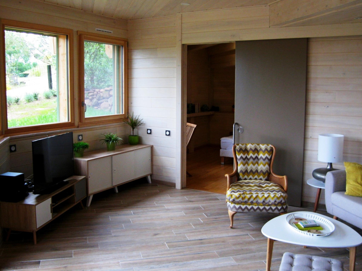 Terrain arboré 140m², terrasse plancher bois (17 m²) avec cuisine d’été, salon de jardin, barbecue, piscine commune (130m²) ouverte de juin à fin septembre (horaire: de 10h à 11h30 – de 16h à 18h30), parking. Superficie 100m². _