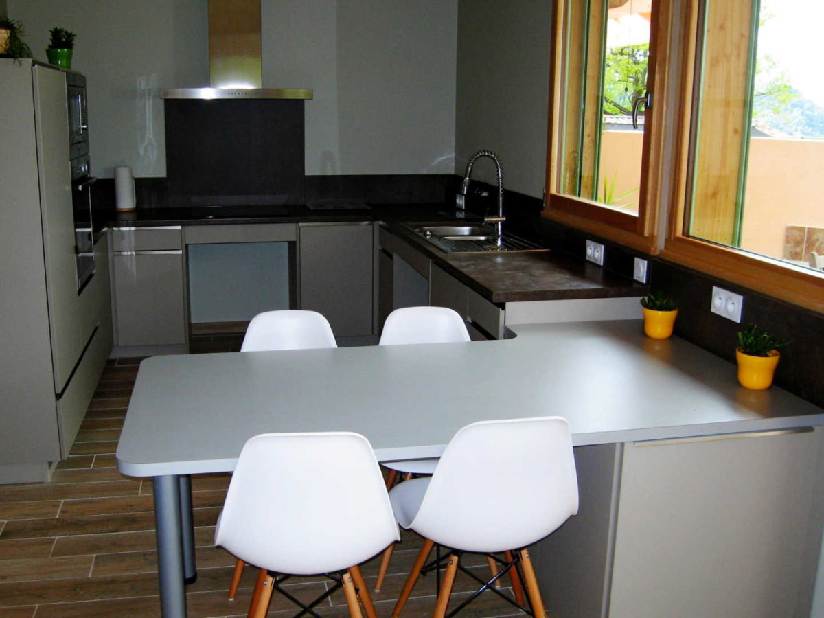 La cuisine équipée est aménagée avec insertion possible sous divers éléments la composant.