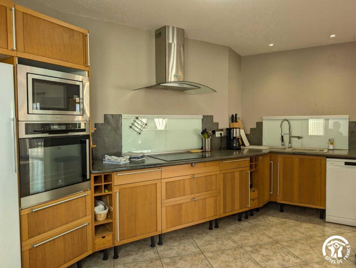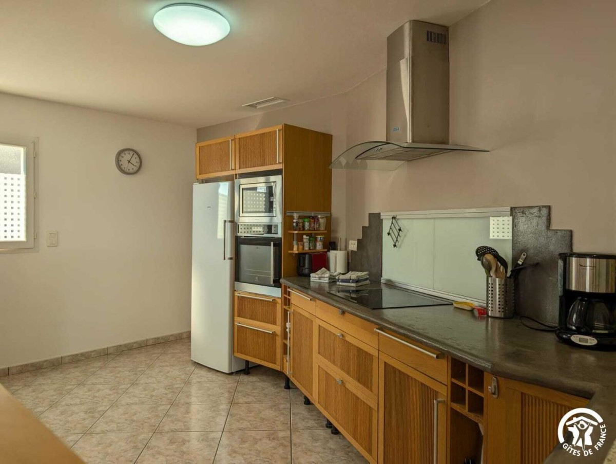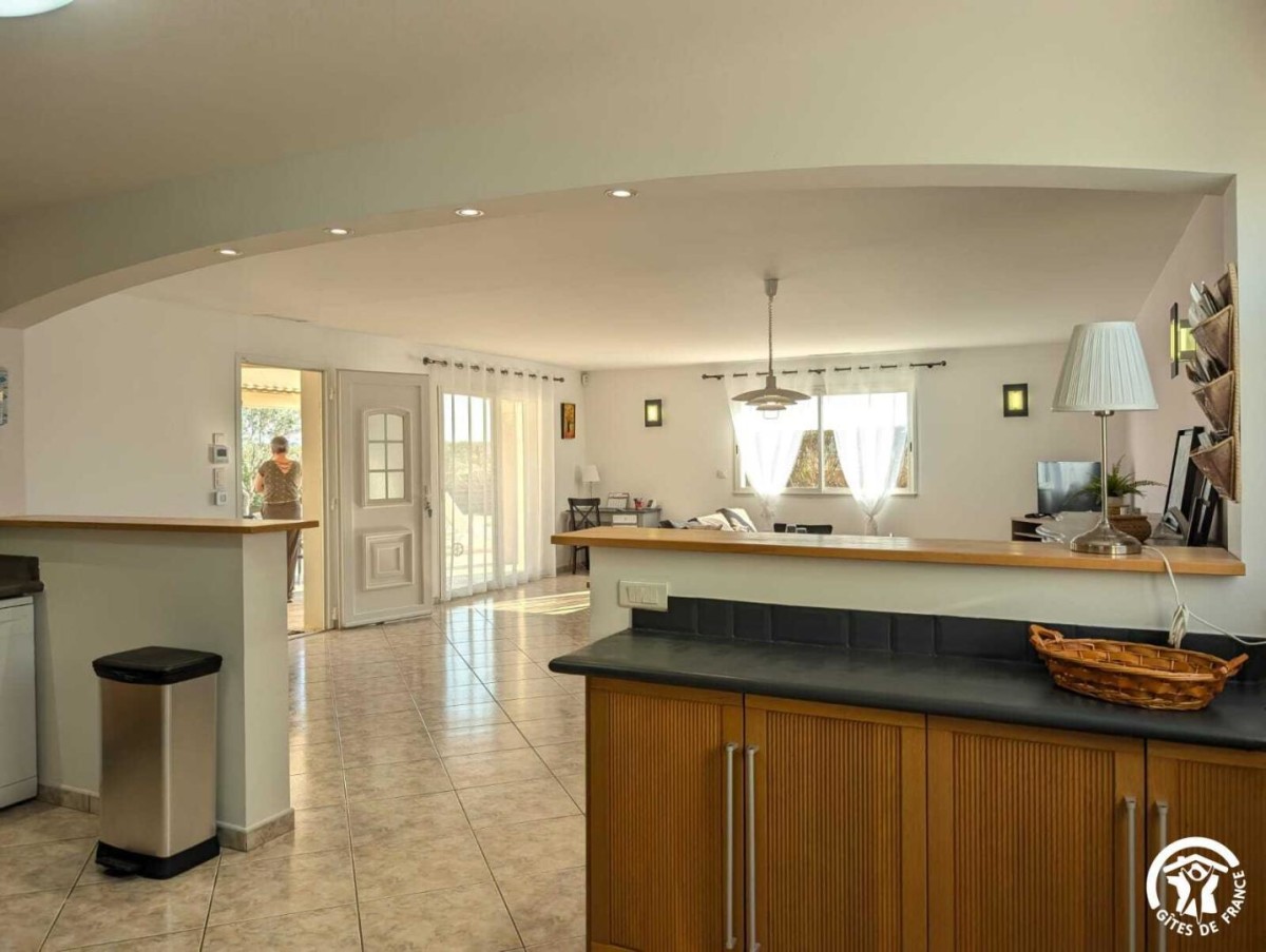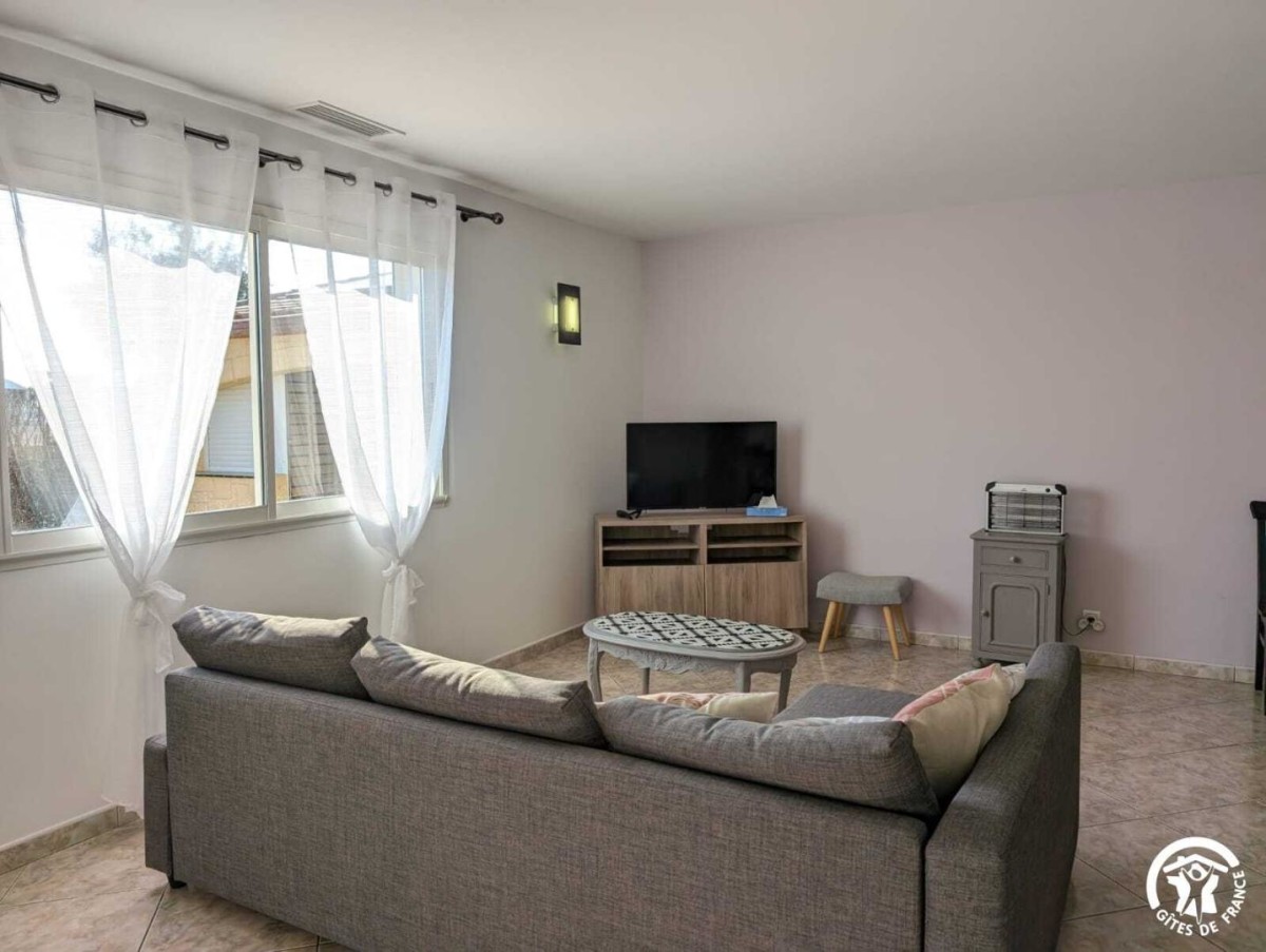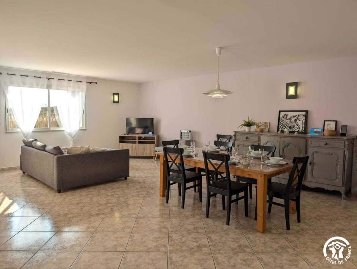 Cette maison indépendante de plain-pied, à l’ambiance traditionnelle, offre une capacité d’accueil de 6 personnes. Elle se compose d’une cuisine ouverte entièrement équipée (plaques de cuisson, frigo, lave-vaisselle, congélateur, cafetière filtre…), d’un espace salle à manger et d’un salon avec canapé et télévision. La partie nuit comprend trois chambres :
