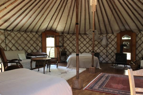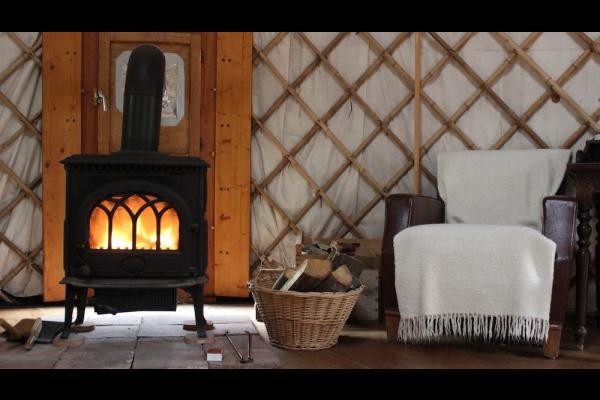 Lumineuse et chaleureuse, cette yourte est chauffée par un poêle à bois, offrant une ambiance cosy même pendant les soirées fraîches.