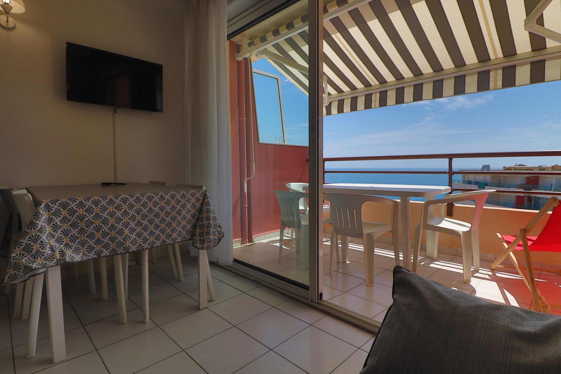 Le séjour lumineux s’ouvre sur la terrasse vue mer. Vous bénéficierez aussi d’une connexion wifi gratuite et d’une place de parking privée.