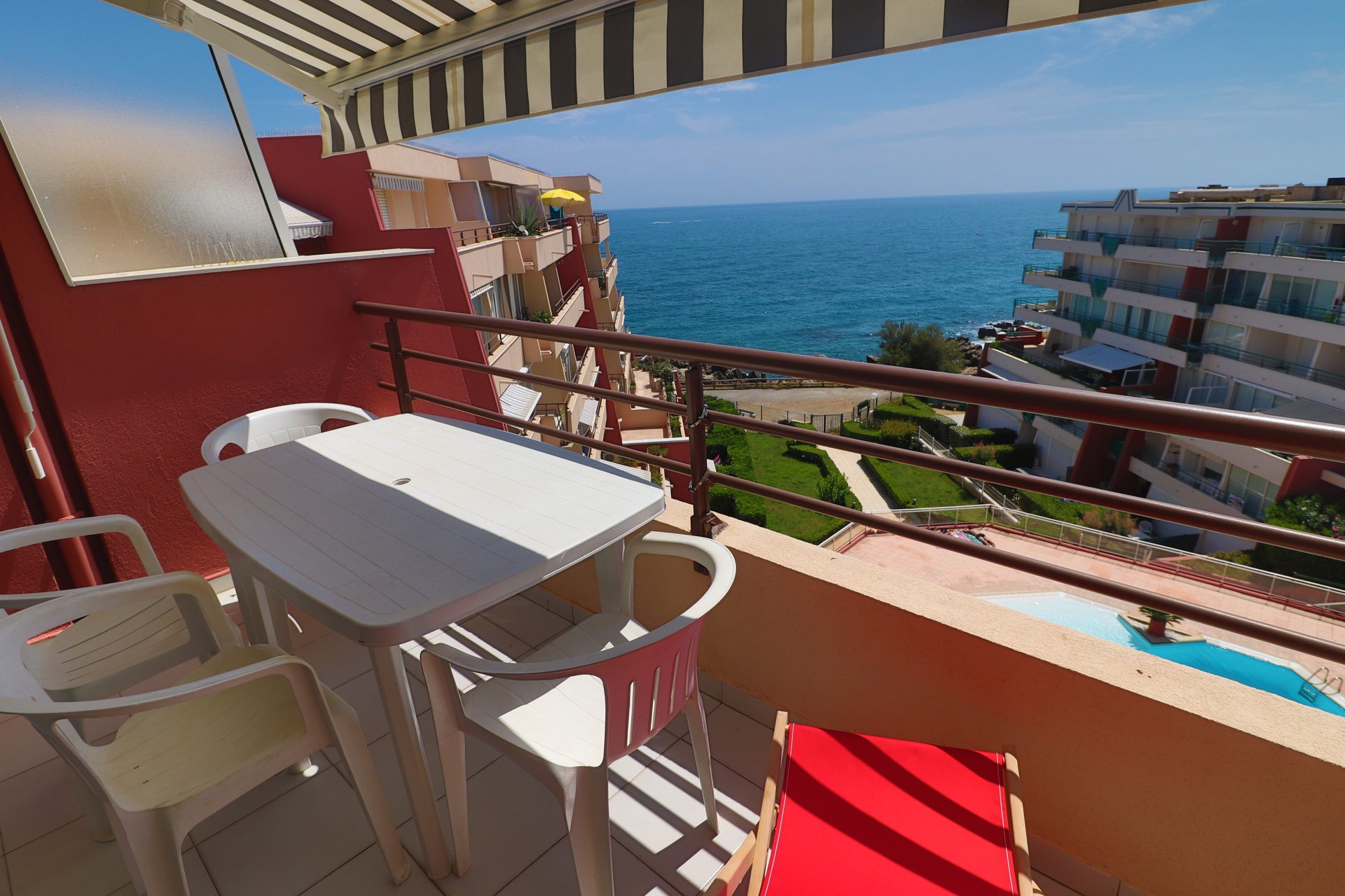 La terrasse avec vue mer, l’accès à la piscine et la plage à proximité : tous les ingrédients sont réunis pour un séjour réussi en famille ou entre amis !