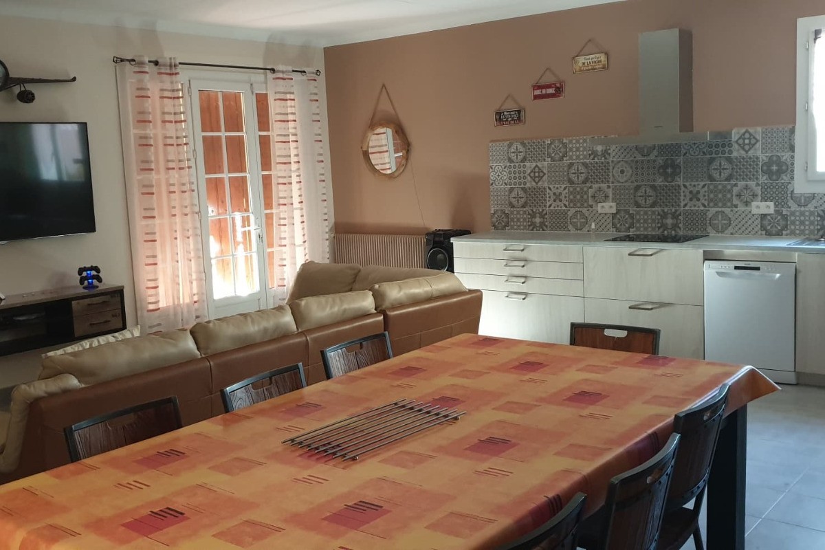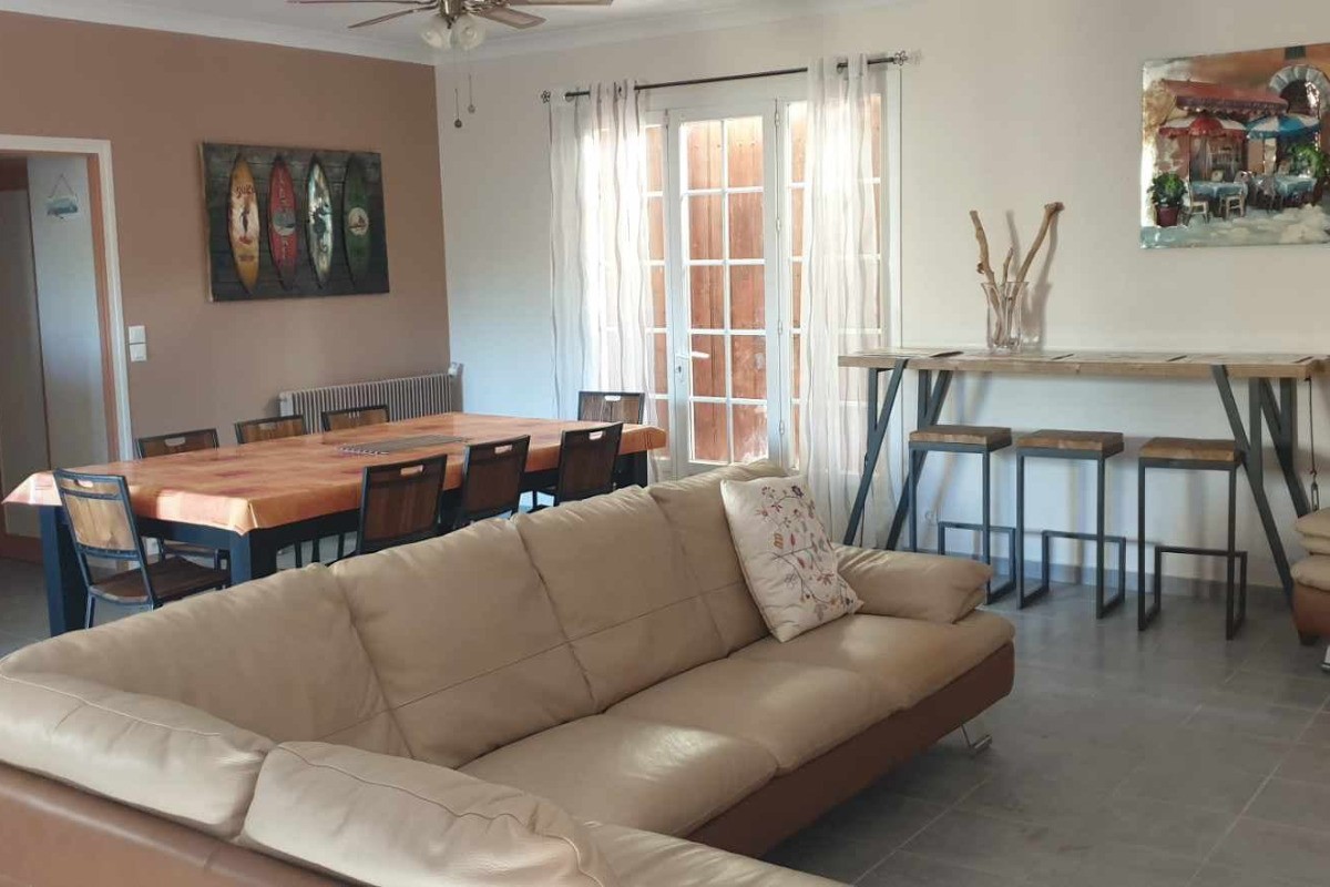 Maison individuelle en rez de chaussée après avoir monté quelques marches extérieures, de 120 m² pour 8 personnes. Séjour TV /internet, espace cuisine équipé : cafetière, micro-ondes, réfrigérateur, congélateur, lave-linge, lave-vaisselle.