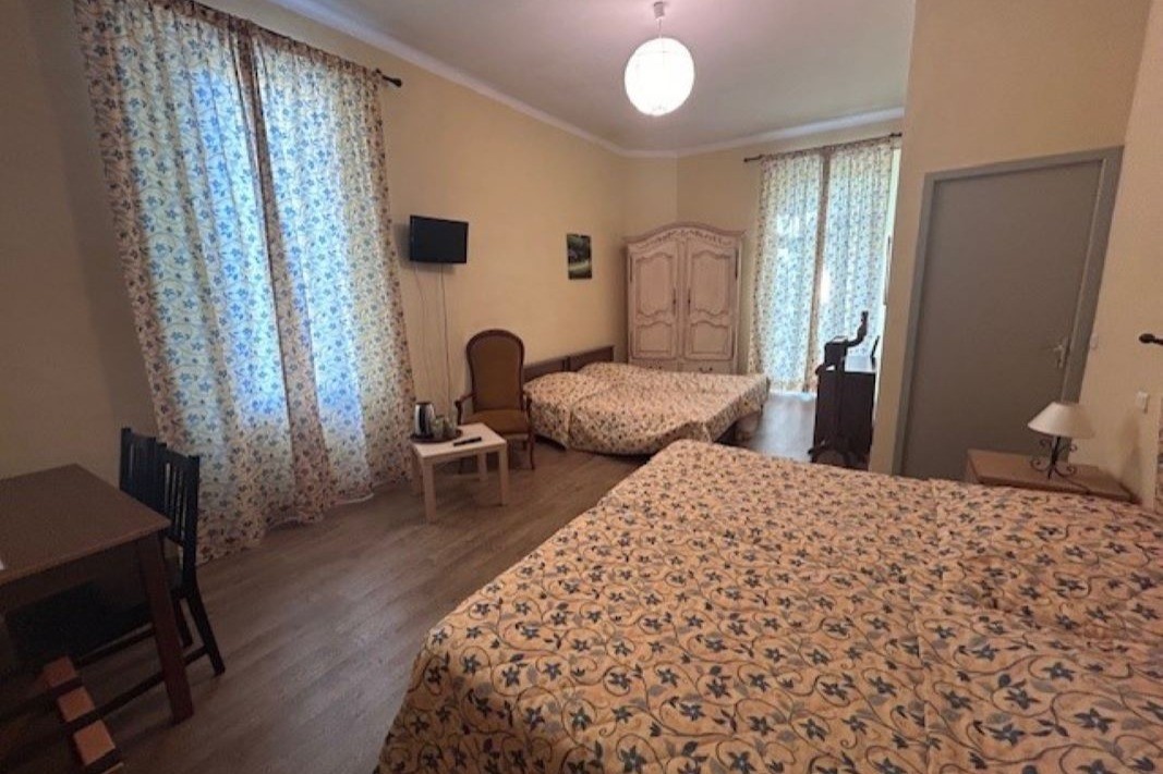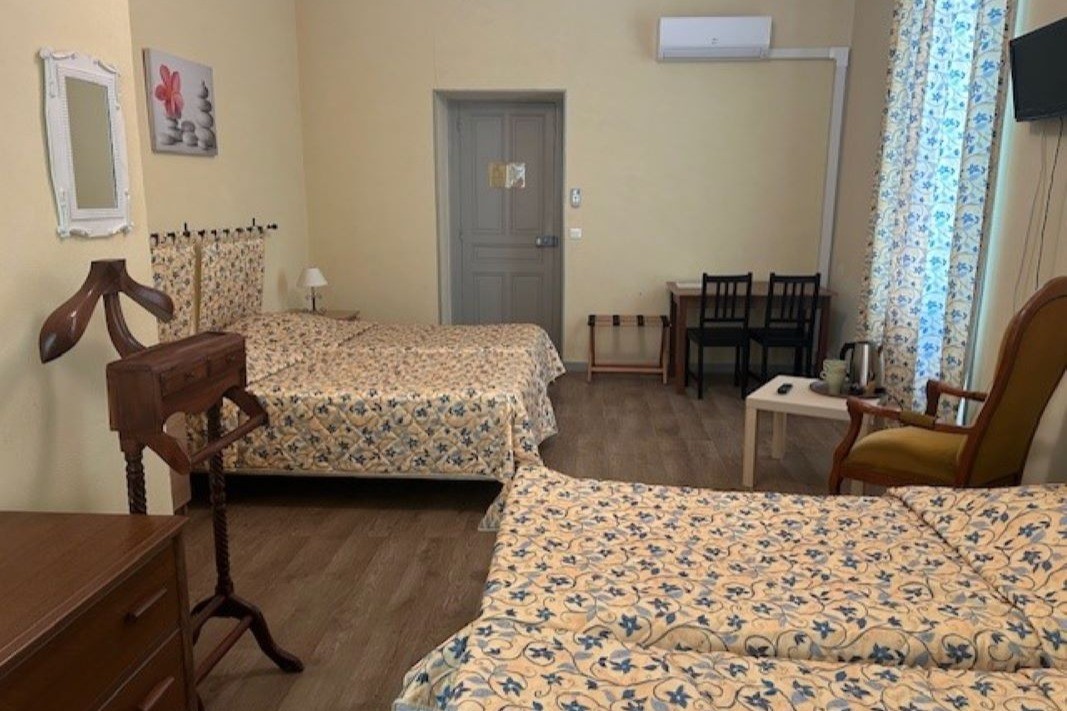 Lors de votre séjour à Laroque vous disposerez d’une chambre décorée simplement offrant une capacité de 4 personnes. Elle est équipée de deux lits de 100cm et deux lits de 90 cm, d’une salle de bain privative avec WC, et de tous les équipements nécessaires, y compris un sèche-cheveux, une climatisation, une télévision et un bureau pour le télétravail. Le Wi-Fi est gratuit, et une table ainsi qu’un fer à repasser sont disponibles sur demande.