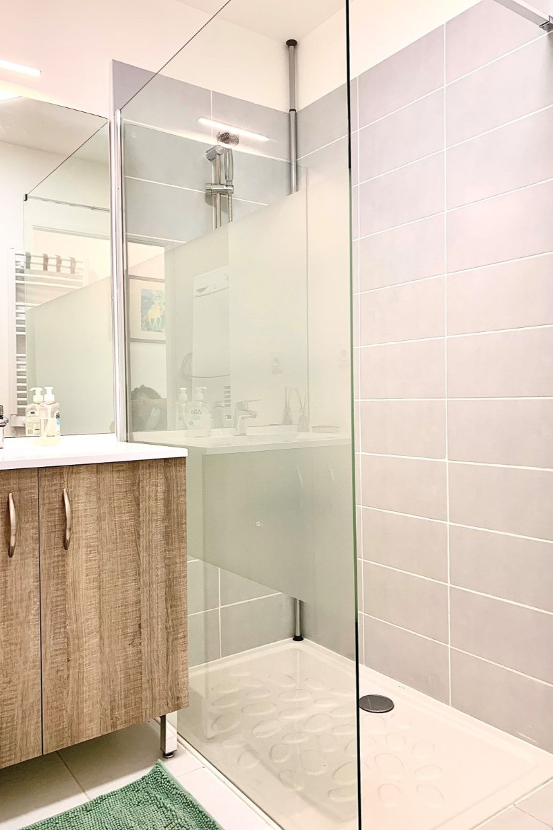 Une salle d’eau avec sa douche à l’italienne . Les toilettes sont séparées. Au sous sol place de parking privatif. Ascenseur.Local à vélo