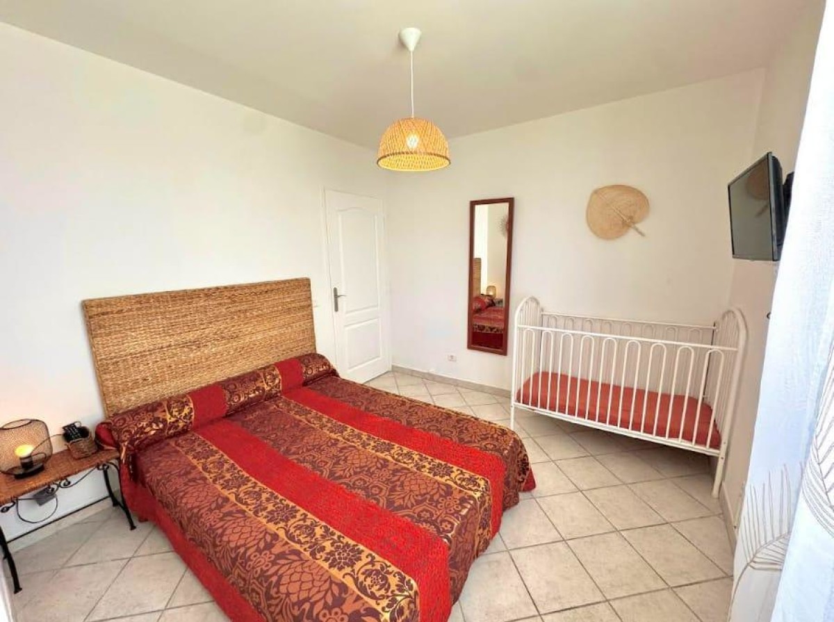 – Une chambre avec un lit en 140×190 et un lit bébé, télévision