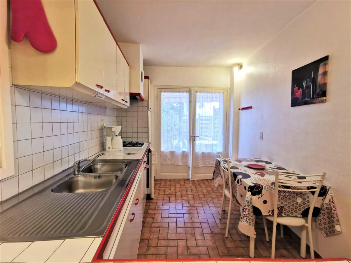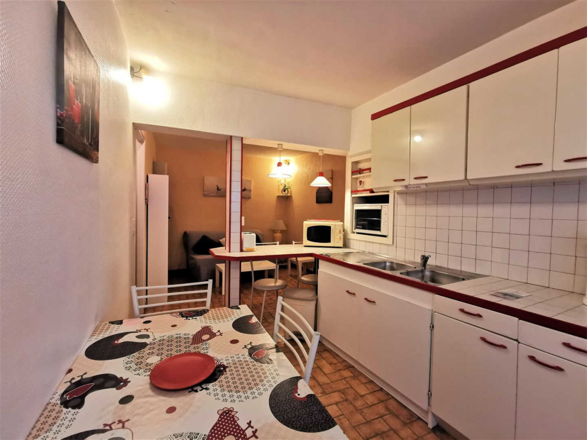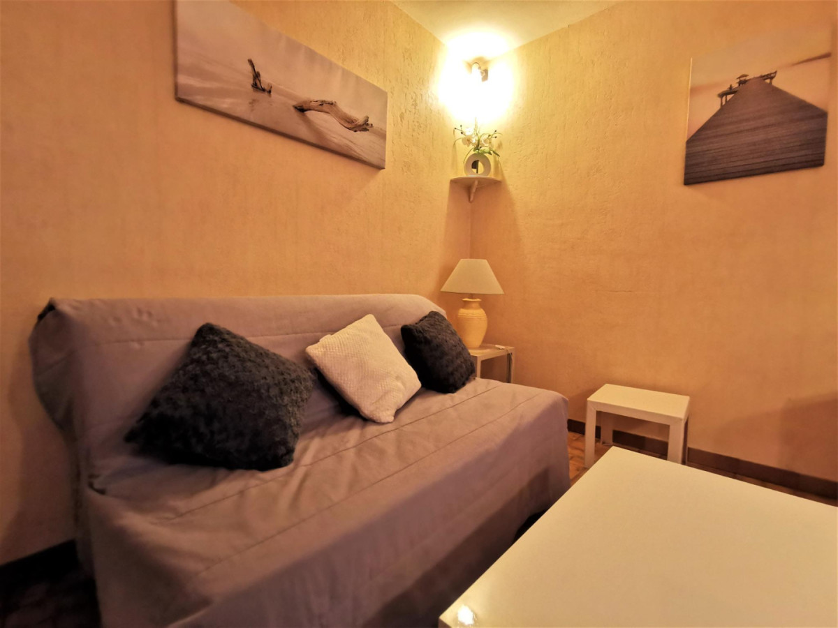 La pièce principale réunit une cuisine fonctionnelle et un coin détente avec un canapé offrant un couchage pour une personne et une télévision.