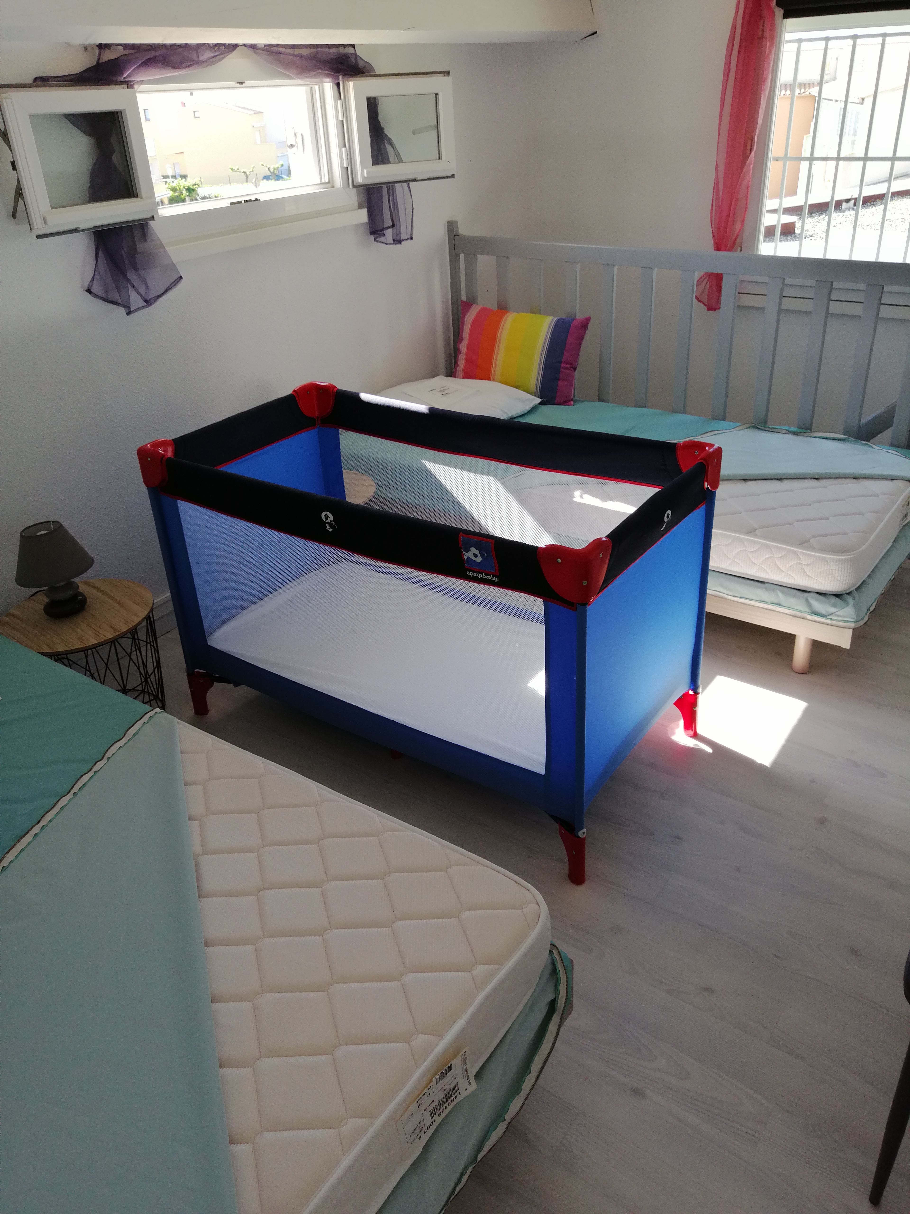 A l’étage : 1 chambre avec 1 lit 140×190 et dressing et 1 mezzanine avec 2 lits 90×140. 1 lit pliant parapluie (bébé).