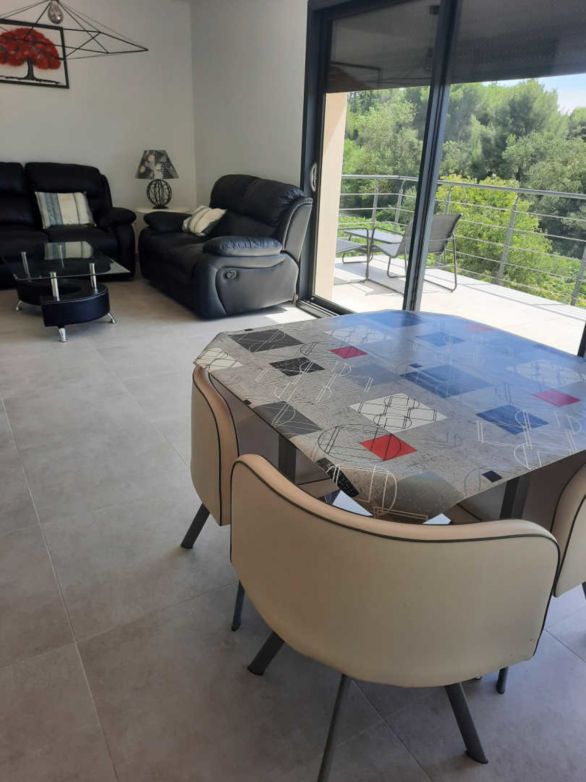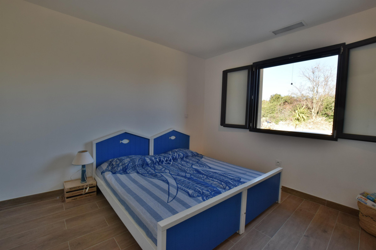Le gîte, qui dispose du Wifi et de la climatisation, s’ouvre sur une grande pièce de vie élégante et bien aménagée avec salon, salle à manger et cuisine. La cuisine équipée et moderne dispose de tout le nécessaire pour profiter au mieux pendant vos vacances : four, micro-ondes, réfrigérateur avec compartiment congélateur, lave-vaisselle, machine à café, bouilloire, ustensiles de cuisine… L’espace salle à manger et salon est lui composé d’une grande table pour prendre les repas, de deux canapés pour regarder la télévision, installée sur un grand meuble de rangement. Vous pourrez accéder depuis cette pièce de vie à un balcon-terrasse, disposant d’un salon de jardin, avec une vue imprenable sur la nature environnante, au calme sous le soleil de l’Hérault.