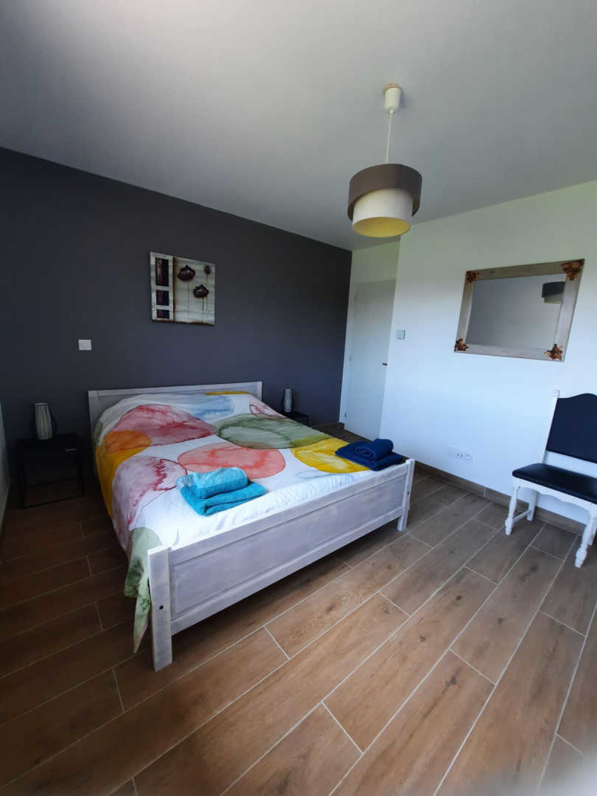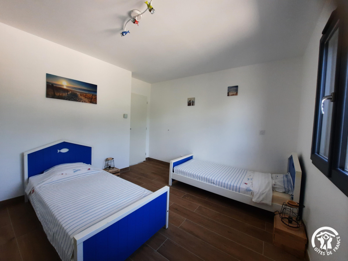 Le gîte possède également deux chambres avec chacune leur propre salle d’eau avec douche à l’italienne et vasque avec miroir ; la première chambre a un lit double 160×200 cm avec une table de chevet, et la deuxième a deux lits simples 90×190 cm qui peuvent se rassembler pour former un lit double 180×190 cm. Le gîte dispose aussi d’une buanderie avec une machine à laver.