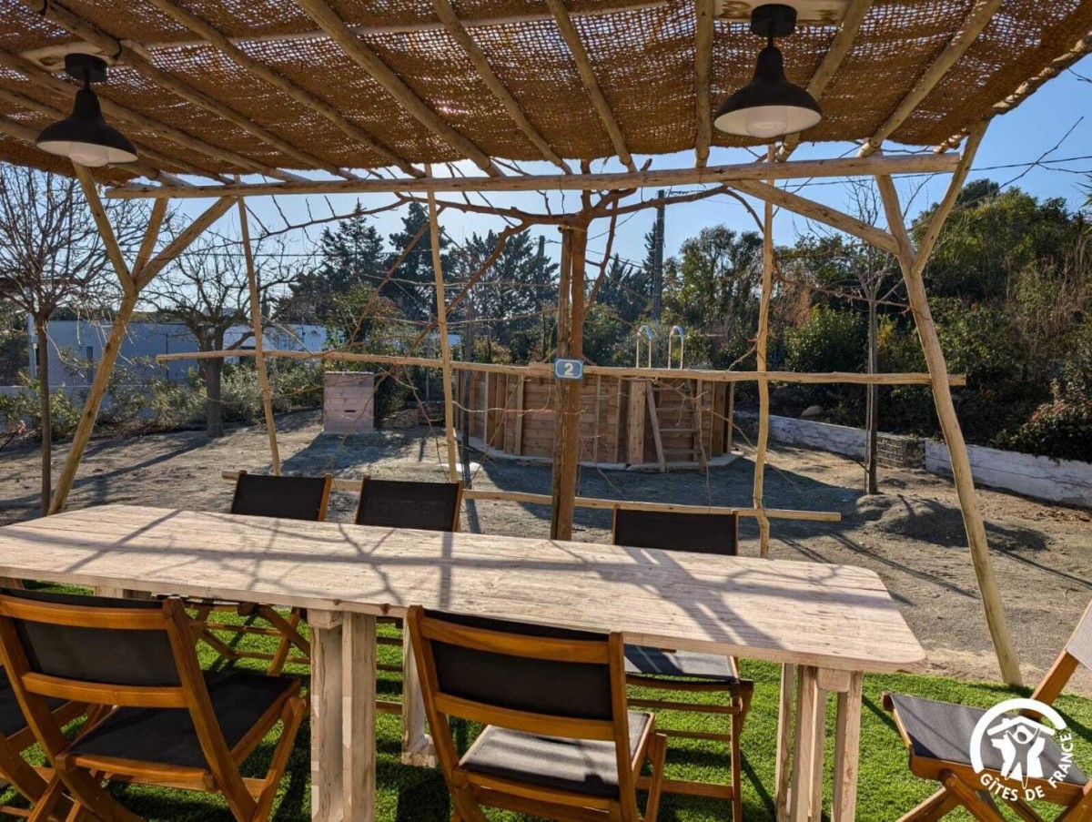 – Une terrasse ombragée avec table et chaises ainsi qu’un espace plus cosy