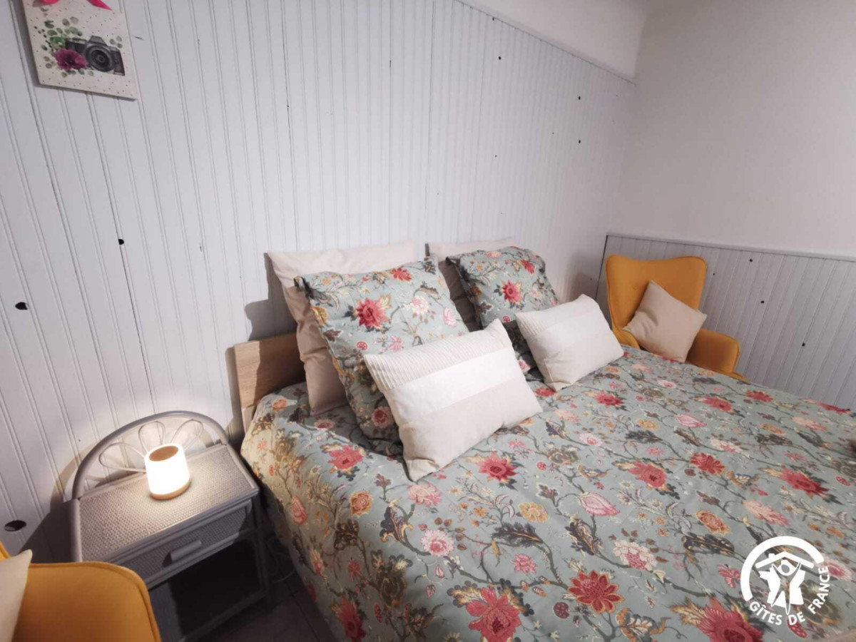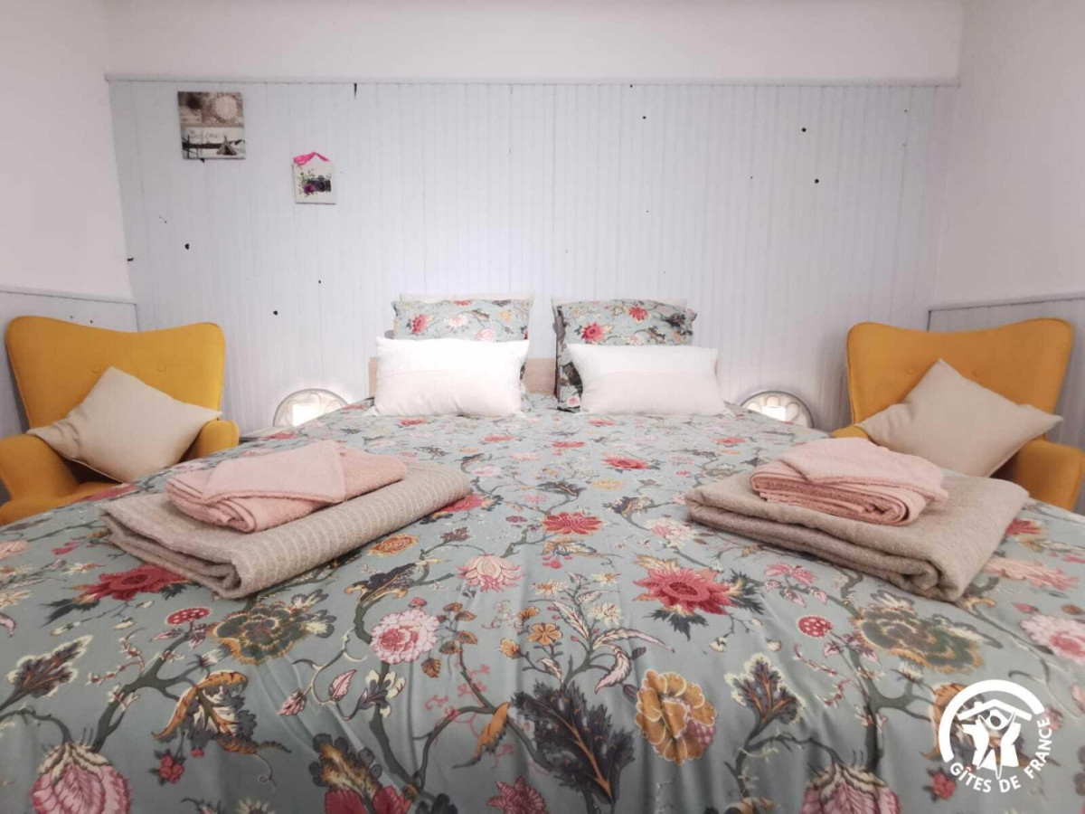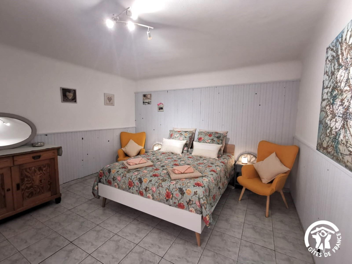 Le gîte dispose également d’une chambre agréablement décorée, avec un lit double en 160 x 200 cm, des tables avec lampes de chevet pour créer des ambiances tamisées, ainsi qu’une salle d’eau avec douche, WC, et vasque avec miroir.