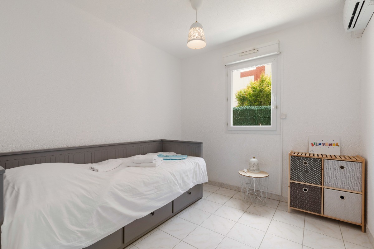 LES CHAMBRES : 2 d’entre elles sont équipées de 2 lits simples (80×200) et (90×200) pouvant être transformés en 1 lit double . La 3ème chambre , idéale pour les enfants est équipée d’un lit gigogne (160/200 déplié) .