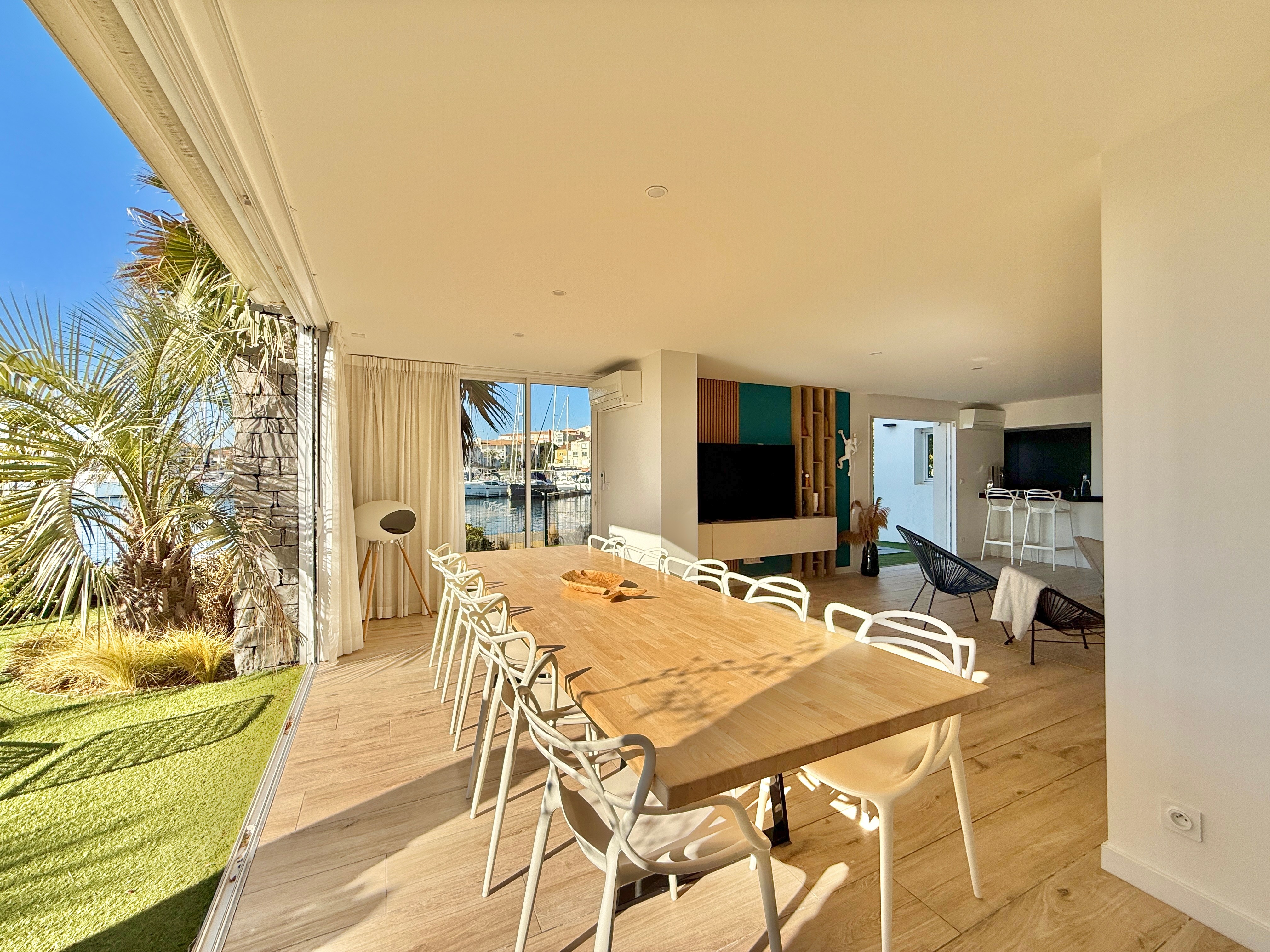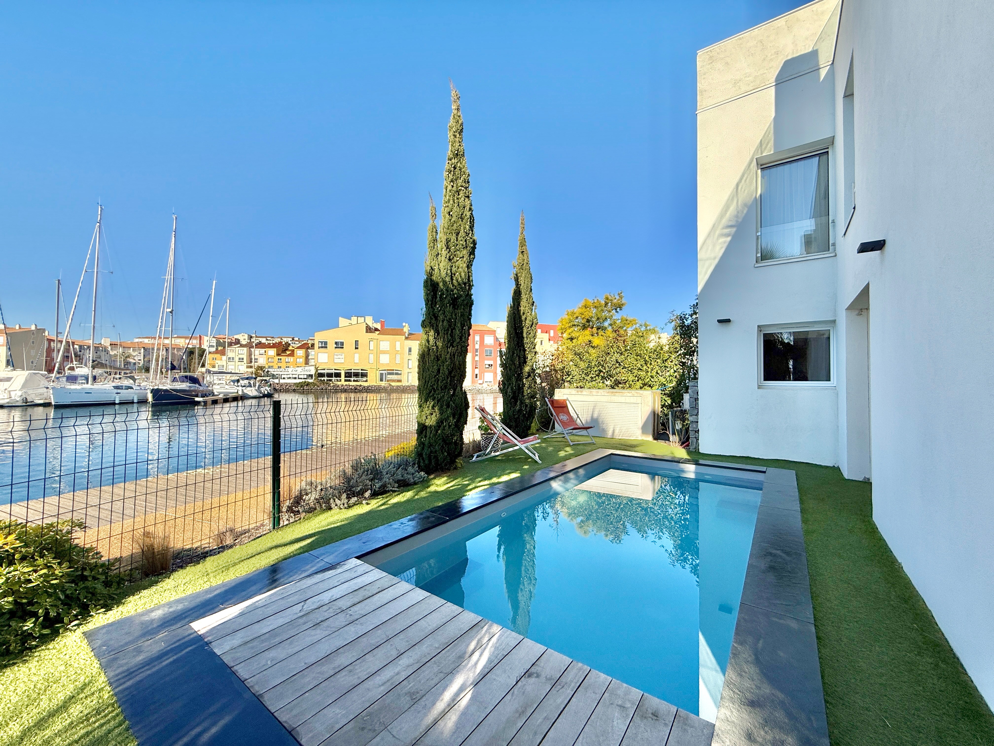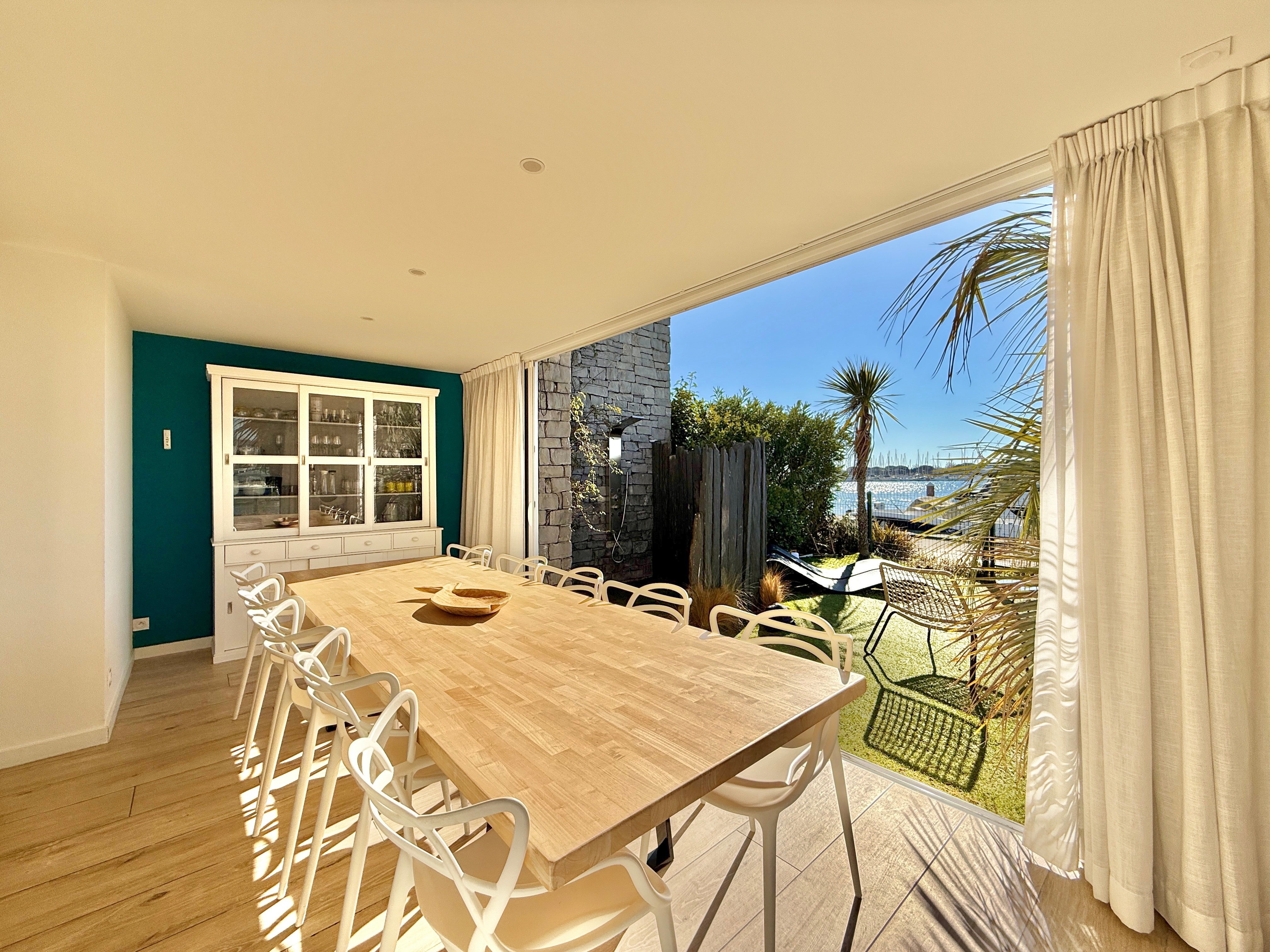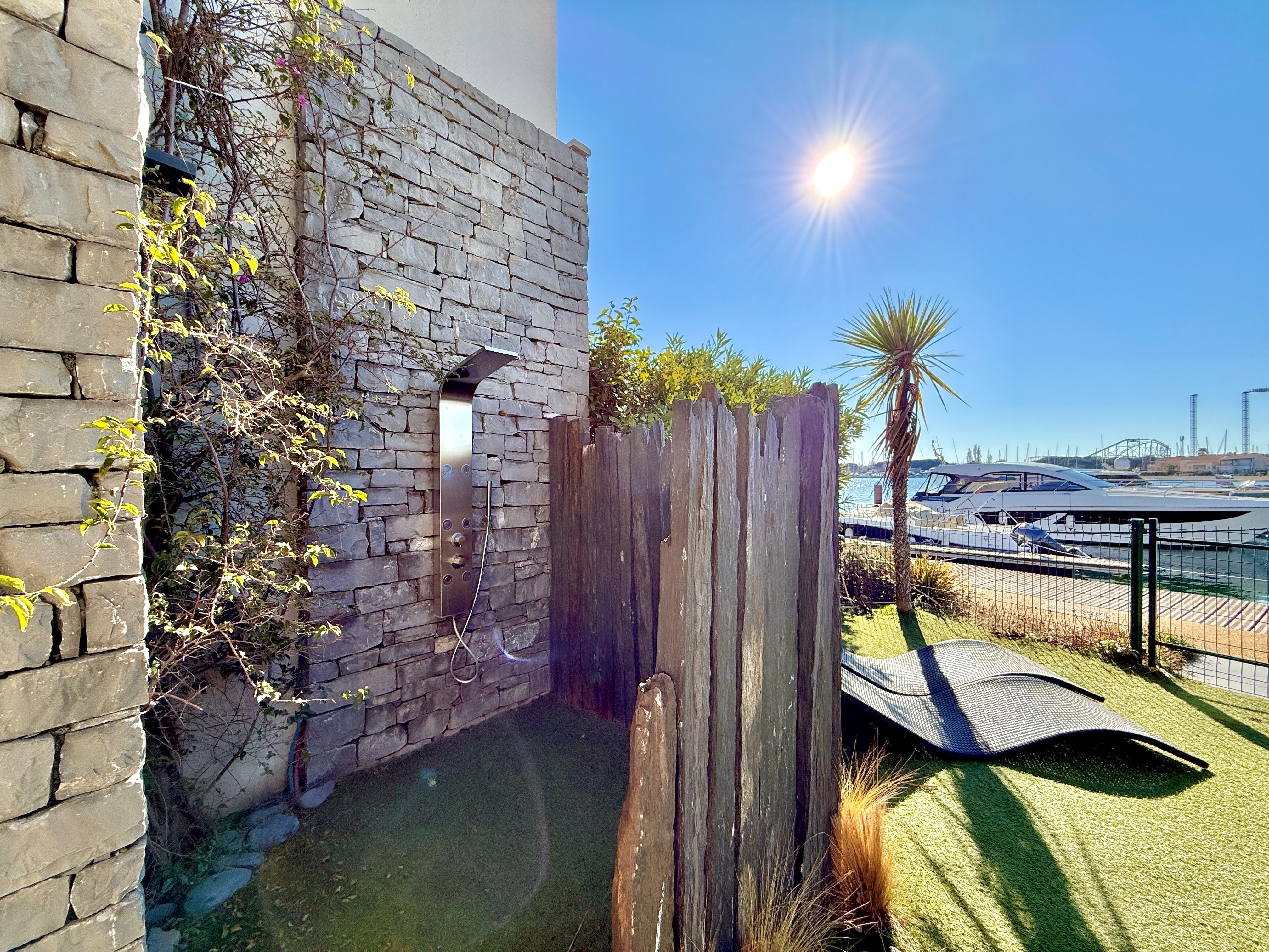 L’extérieur est tout aussi exceptionnel avec une piscine chauffée équipée d’une nage à contre-courant, un salon de jardin et une douche extérieure. Son accès direct au quai en fait un lieu idéal pour les amateurs de navigation.