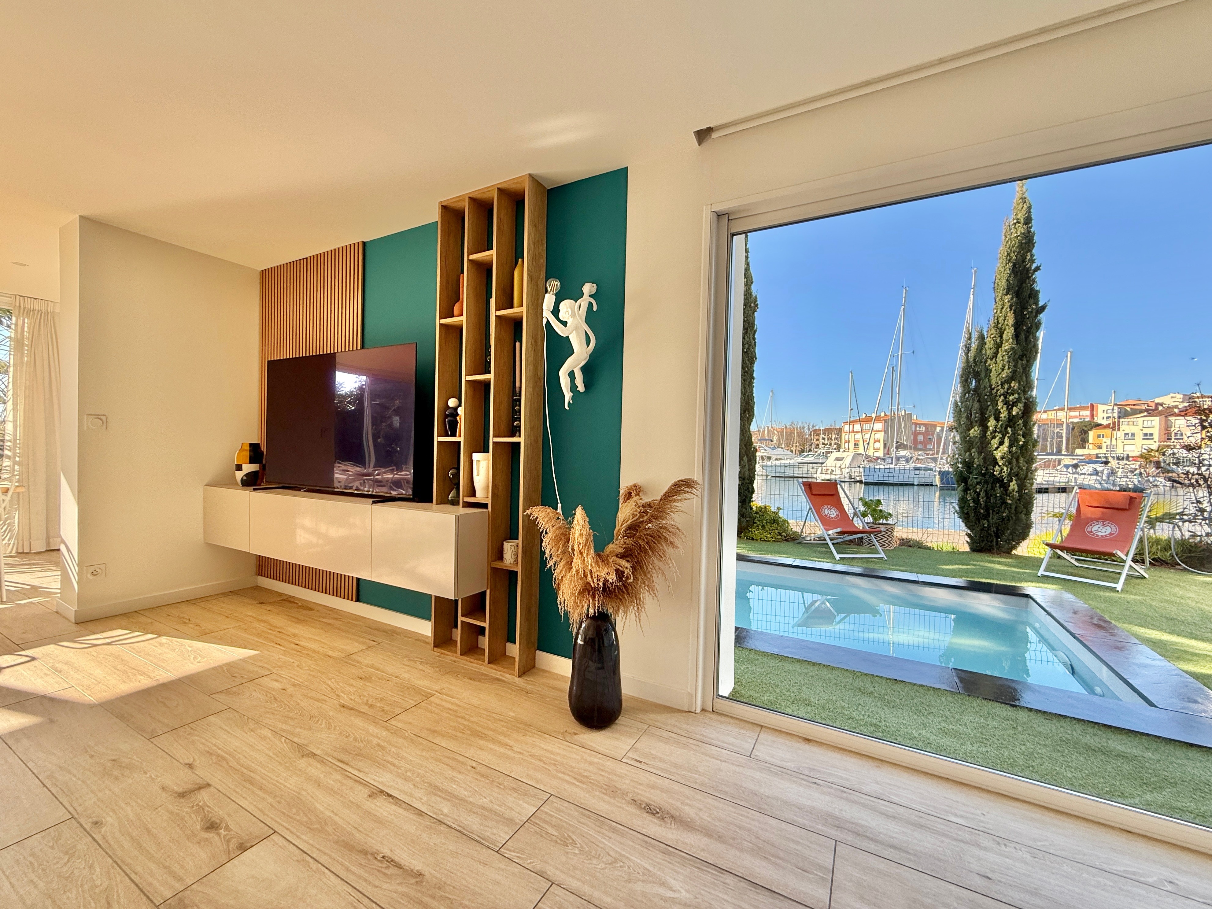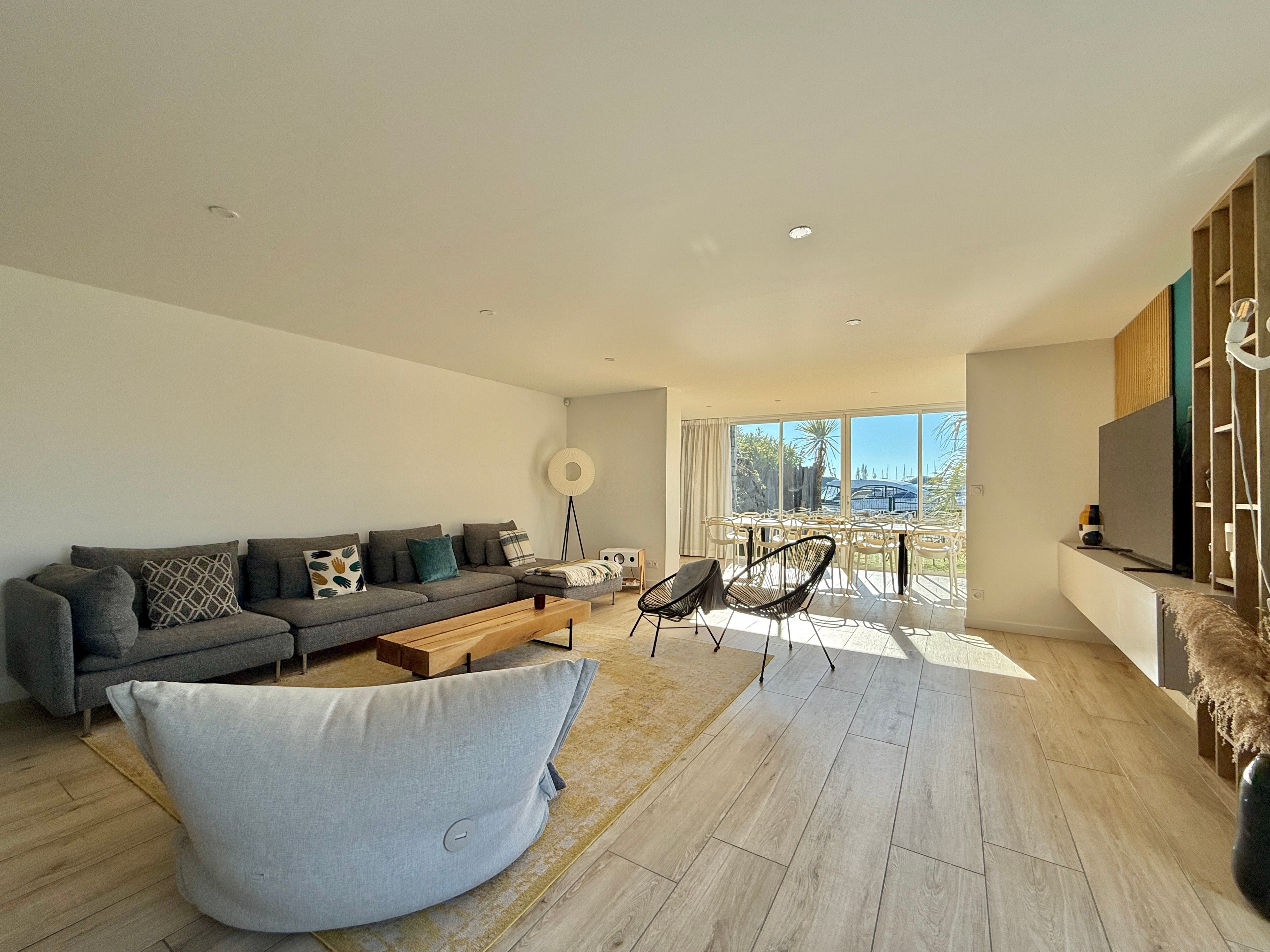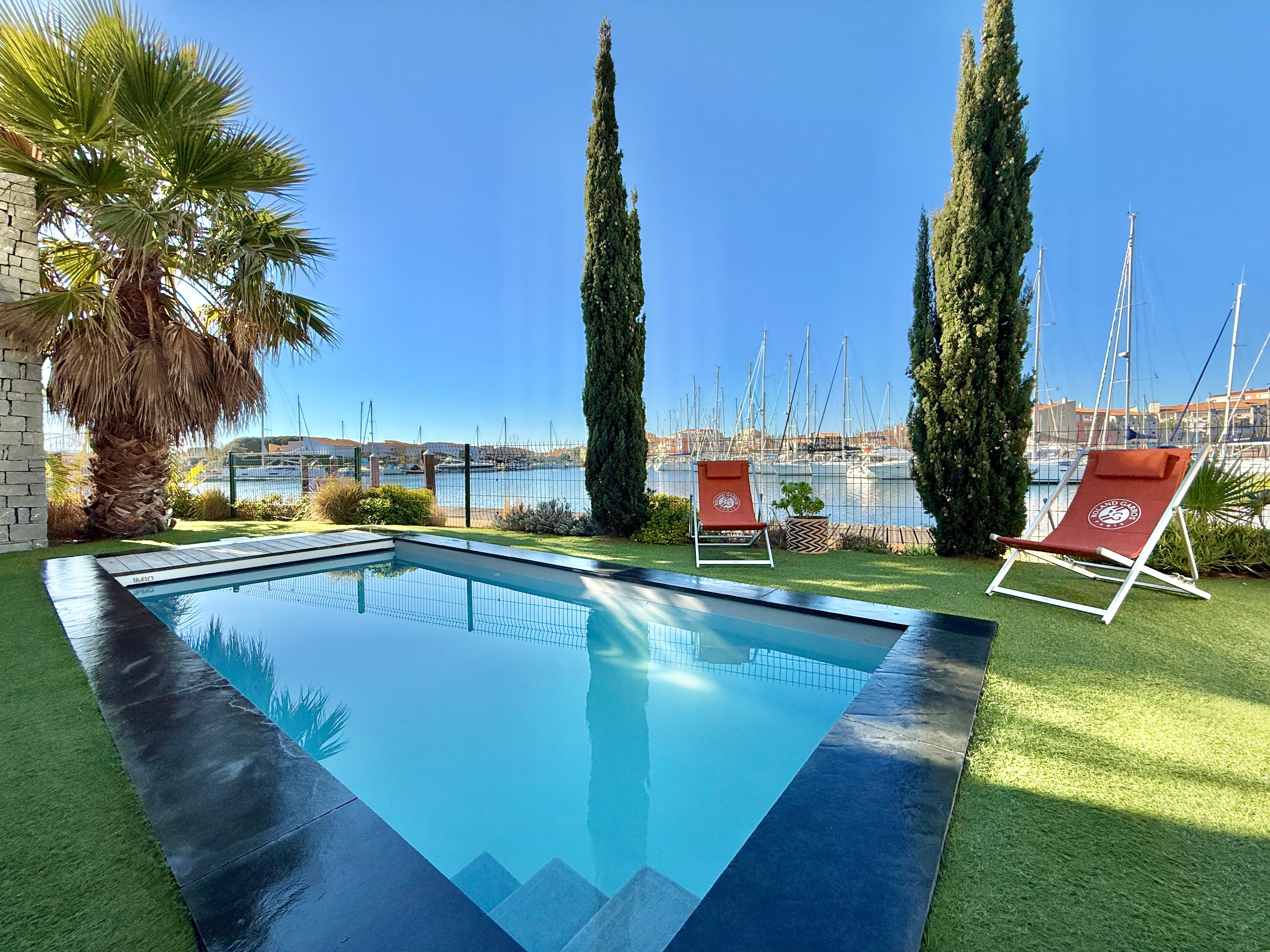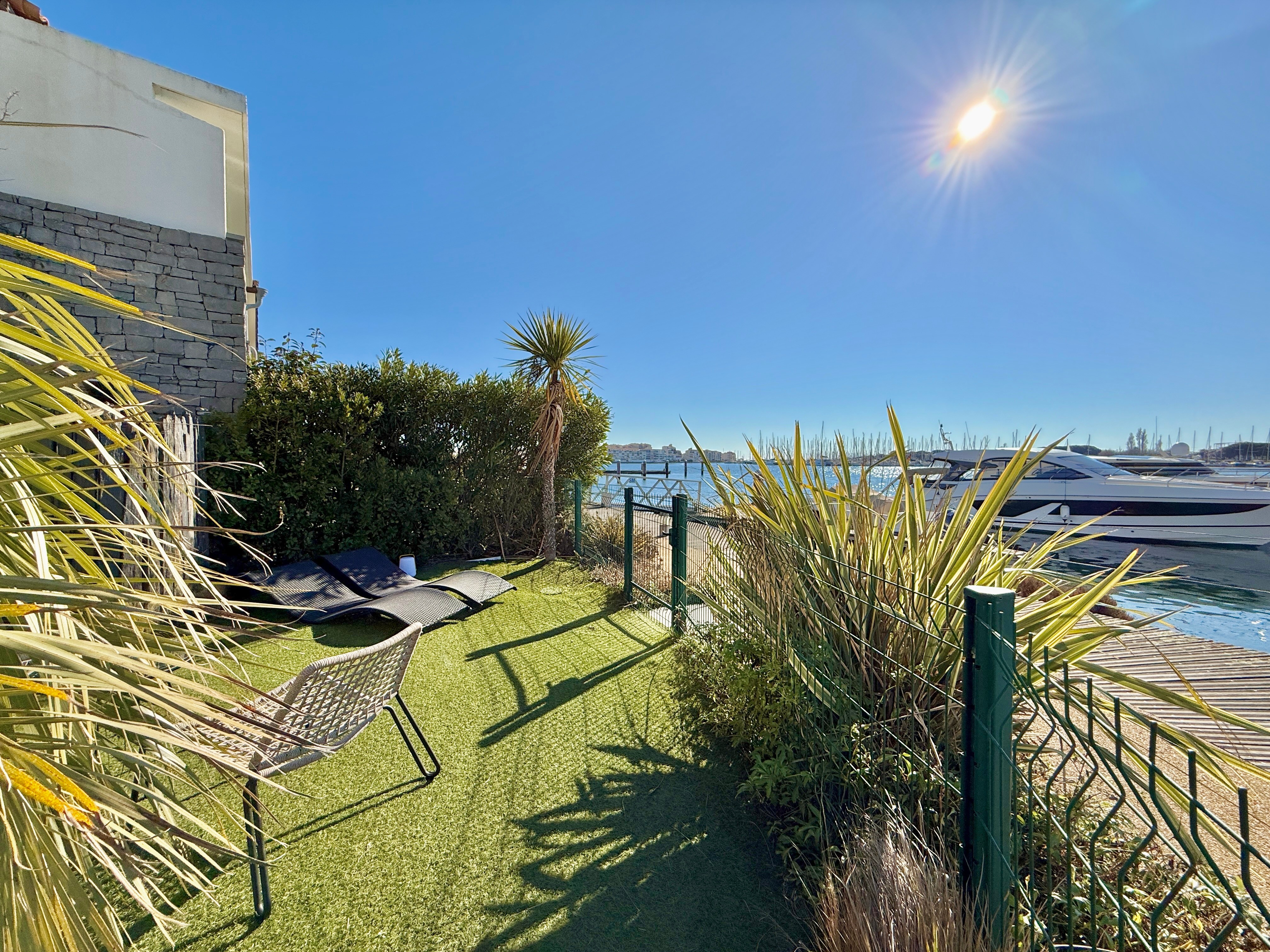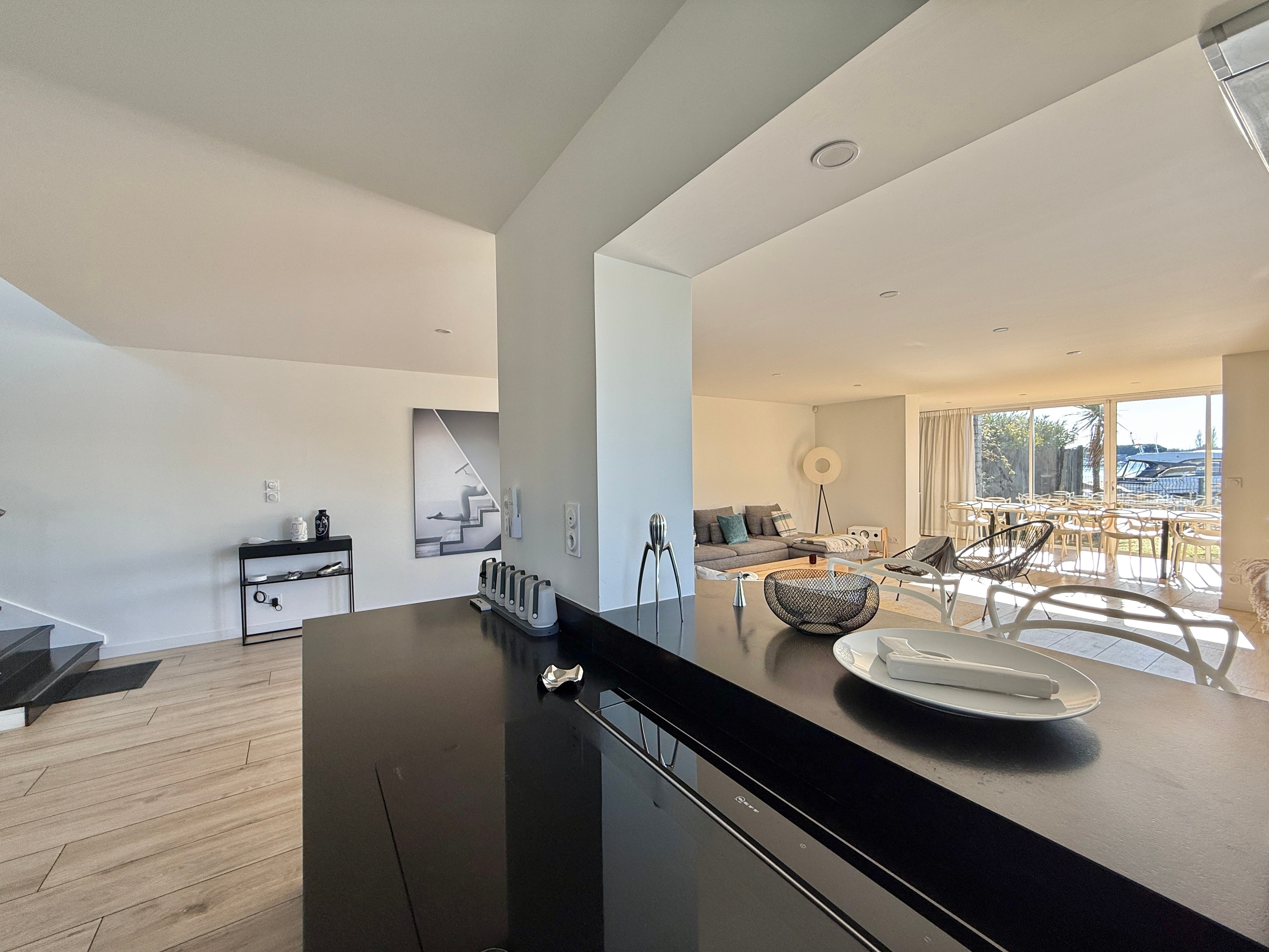 L’extérieur est tout aussi exceptionnel avec une piscine chauffée équipée d’une nage à contre-courant, un salon de jardin et une douche extérieure. Son accès direct au quai en fait un lieu idéal pour les amateurs de navigation.