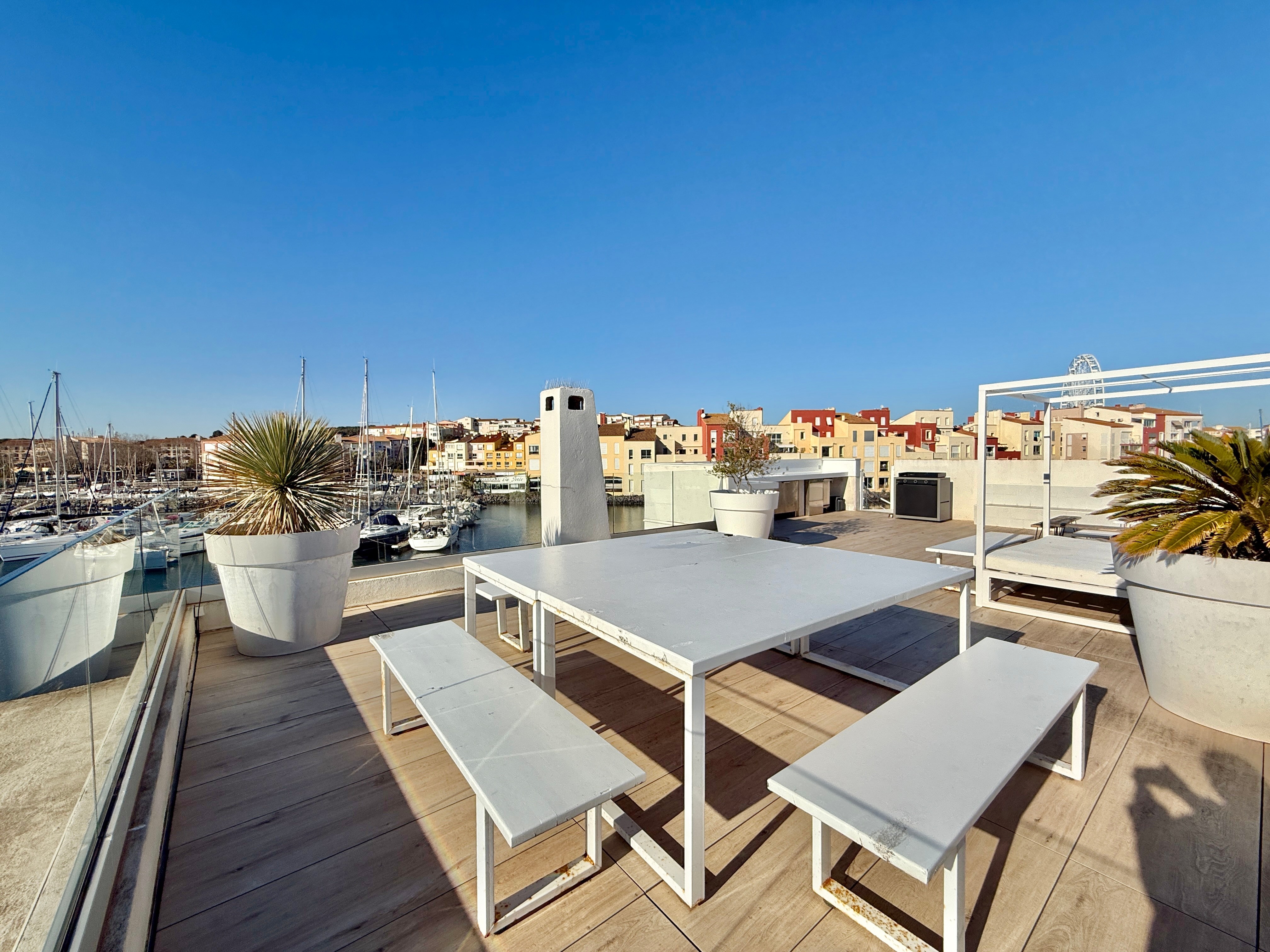 Le rooftop de 100 m² est un véritable havre de paix, offrant une vue à 360° sur la station et le port. Il est aménagé avec une cuisine extérieure équipée, une plancha et un lit balinais, parfaits pour des moments de détente et des soirées conviviales entre amis ou en famille.