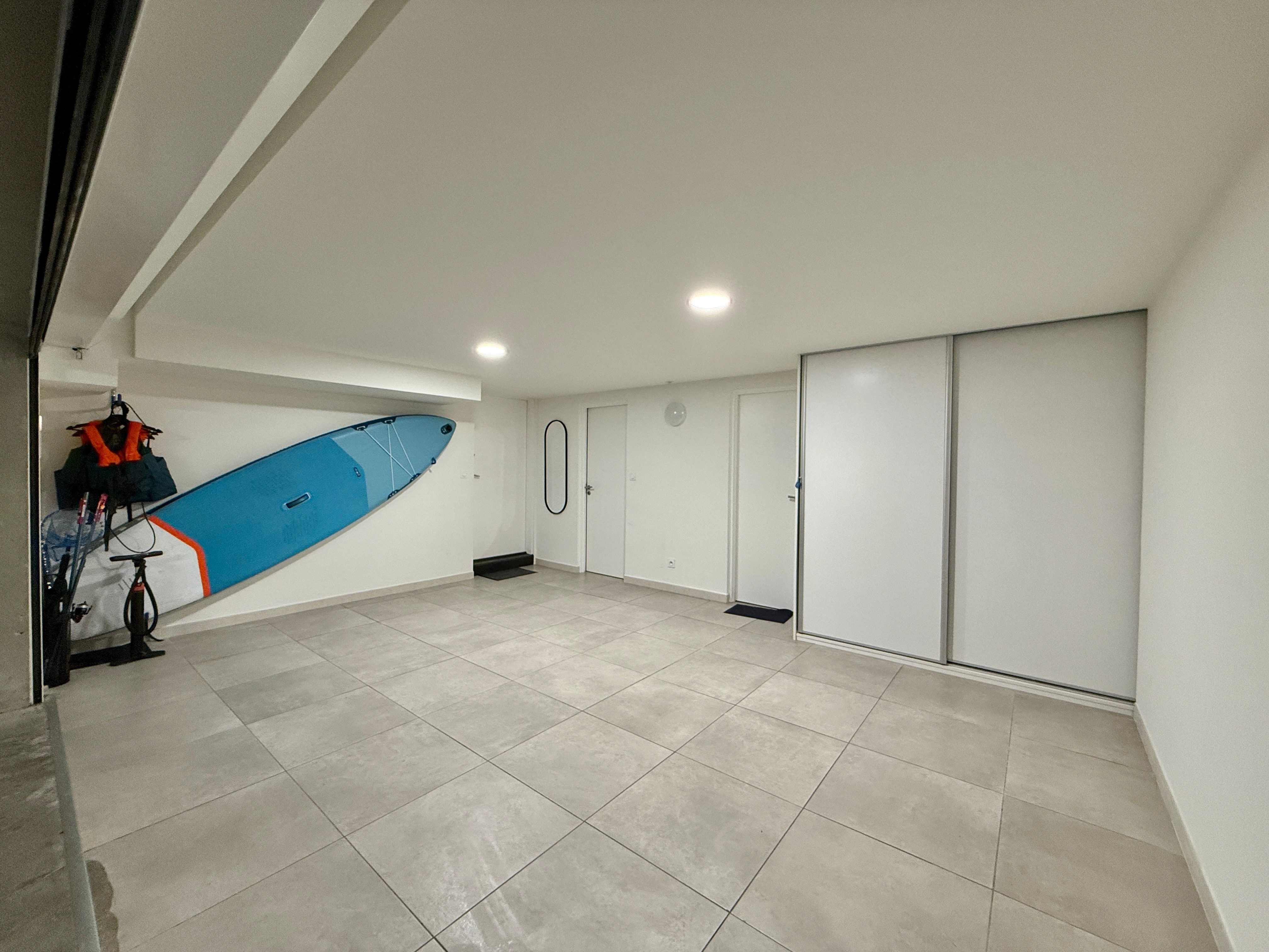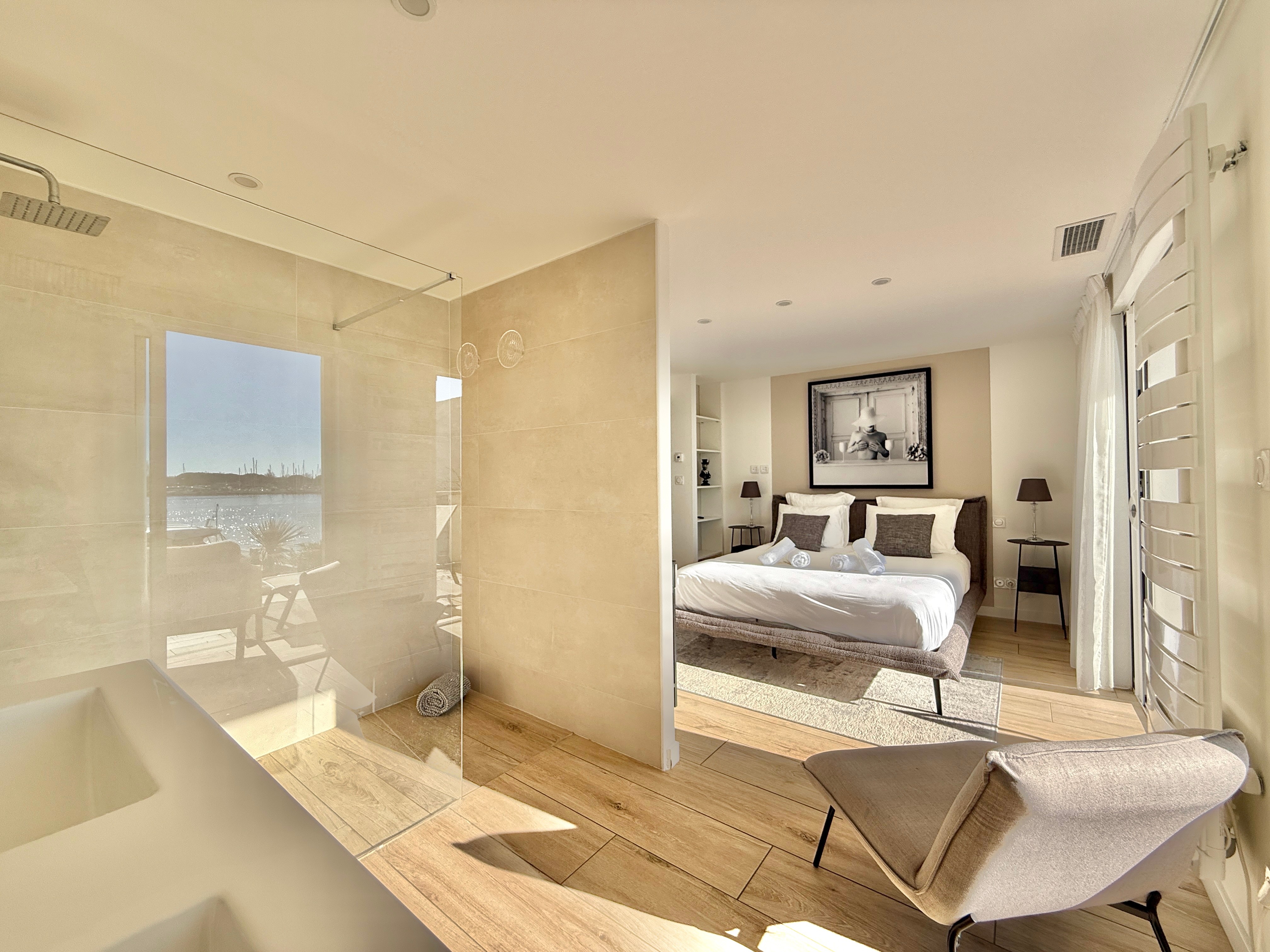 À l’étage, la suite parentale dispose d’un dressing, d’une salle d’eau et d’une terrasse privée offrant une vue panoramique sur le port. Une chambre double et un dortoir composé de six couchages complètent cet espace, ainsi qu’une salle d’eau et un WC supplémentaires pour plus de confort.