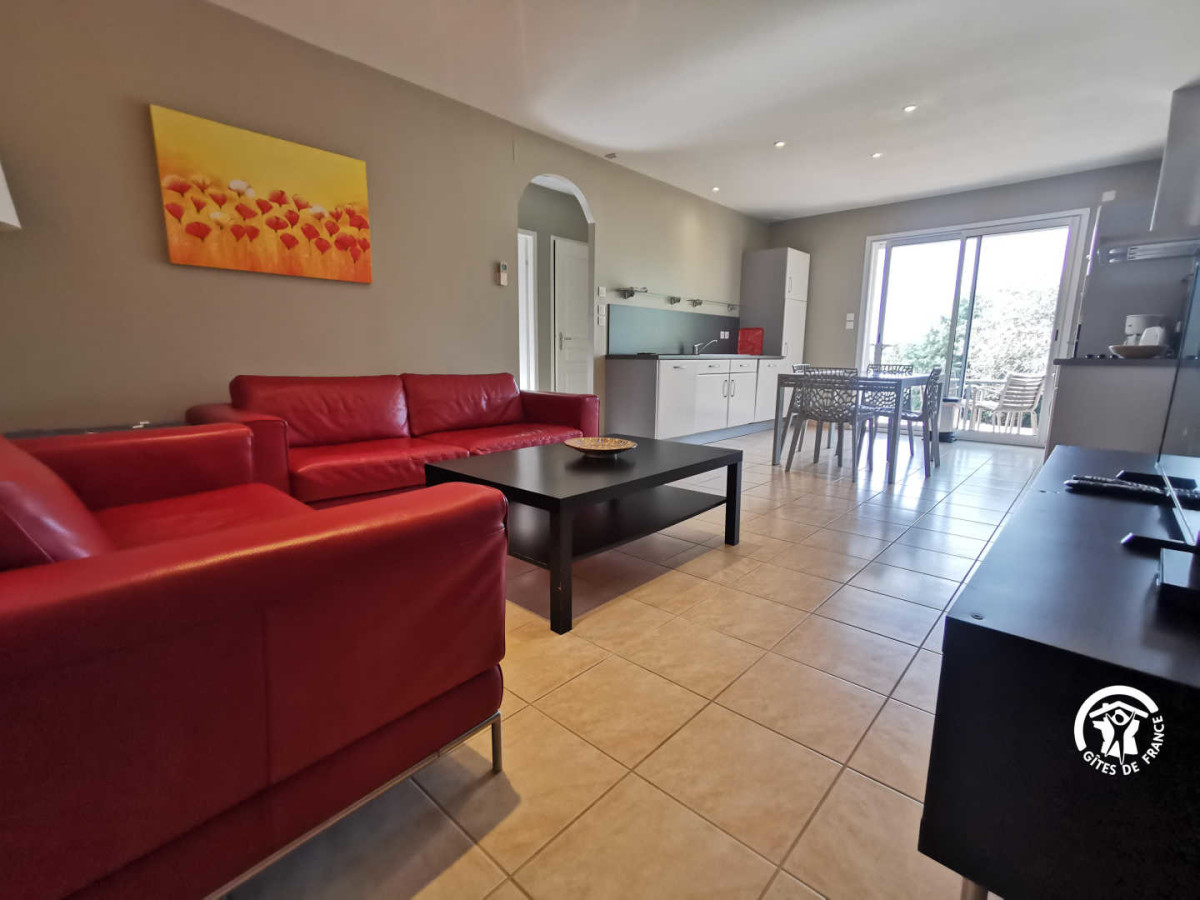 Le Gîte SYRAH est composé d’une cuisine équipée ouverte sur le séjour/salon. La pièce de vie donne accès à une terrasse privative avec barbecue et mobilier de jardin.