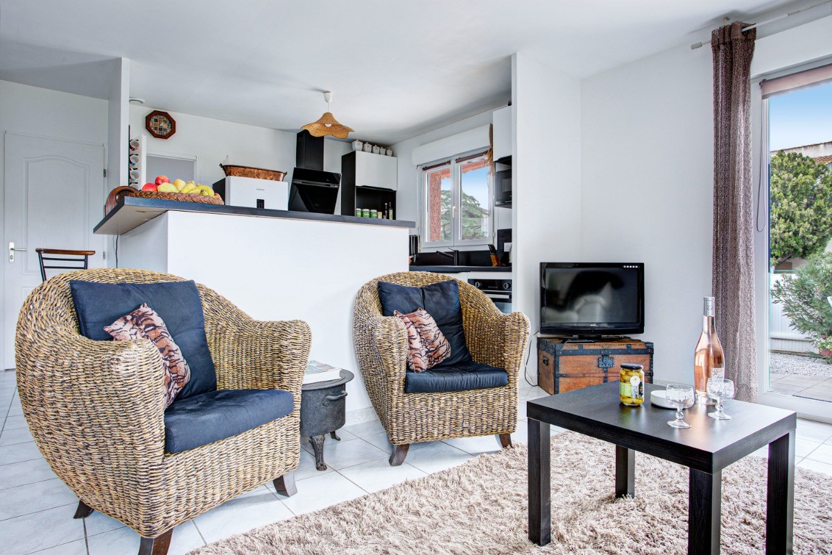 – à l’extérieur, vous pourrez profiter d’un jardin clôturé pour détente ou jeux, de deux terrasses dont une, exposée plein Sud offre un salon de détente et plancha, idéale pour les moments de détente et/ou de convivialité. Imaginez vous, à l’heure de l’apéro, confortablement installé, entouré de végétation en sirotant votre apéro tous en préparant vos grillades sur la plancha.