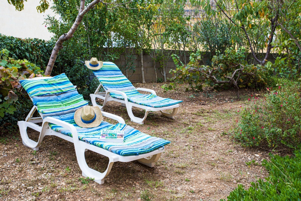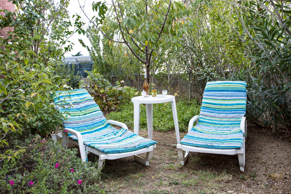 Des chaises longues sont à disposition pour prendre le soleil ou lire un livre à l’ombre de la végétation. Dans le jardin la végétation est omni présente. vous y trouverez des lauriers roses, des figuiers, un pêcher, des ceps de vigne, un cerisier, des arbustes de ciste, de sauge, d’hibiscus ainsi que des sauges, des marguerites du cap et des agapanthes.