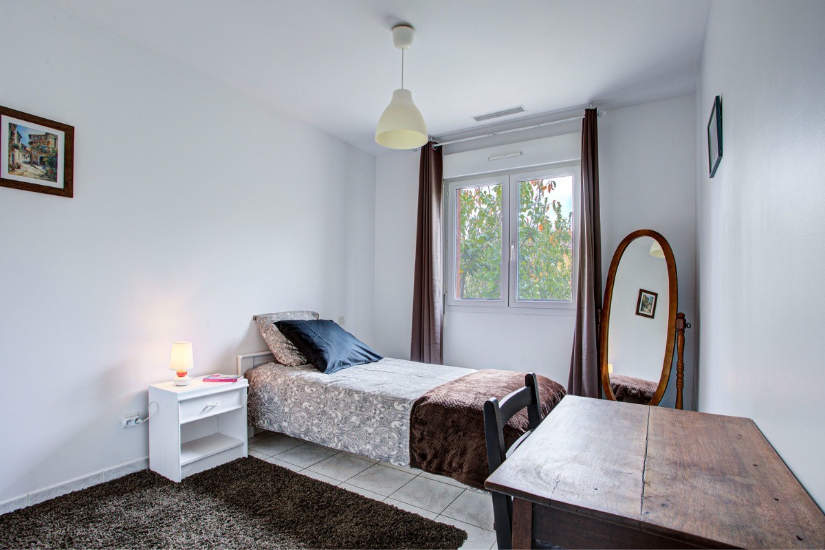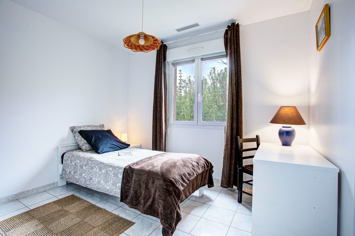 – 3 chambres, dont 2 chambres avec lits en 90 cm et une 3e chambre avec un lit en 140 cm. Chacune des chambres est équipée de rangements, d’un petit bureau, d’un chevet avec lampe de chevet. La chambre avec le lit en 140 cm donne également accès à une terrasse privée.