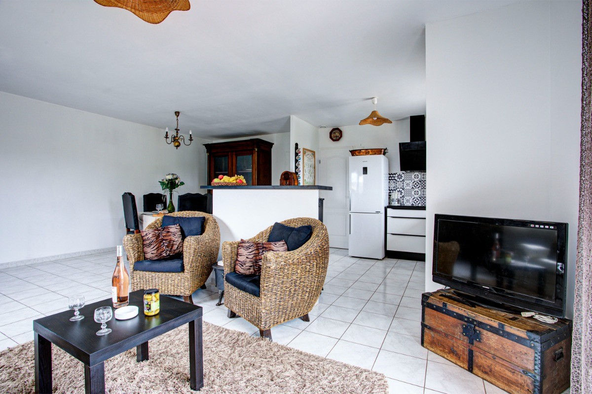 – Un grand séjour agréable et parfait pour se détendre avec son coin salon avec télévision et accès wifi, son canapé confortable en cuir et ses 2 fauteuils en rotin + son espace repas et la cuisine ouverte, équipée et récente (plaques à induction 3 feux, hotte aspirante, four et micro-ondes, cafetière Senseo et à filtre, bouilloire, grille-pain,…). Tout pour cuisiner comme à la maison !