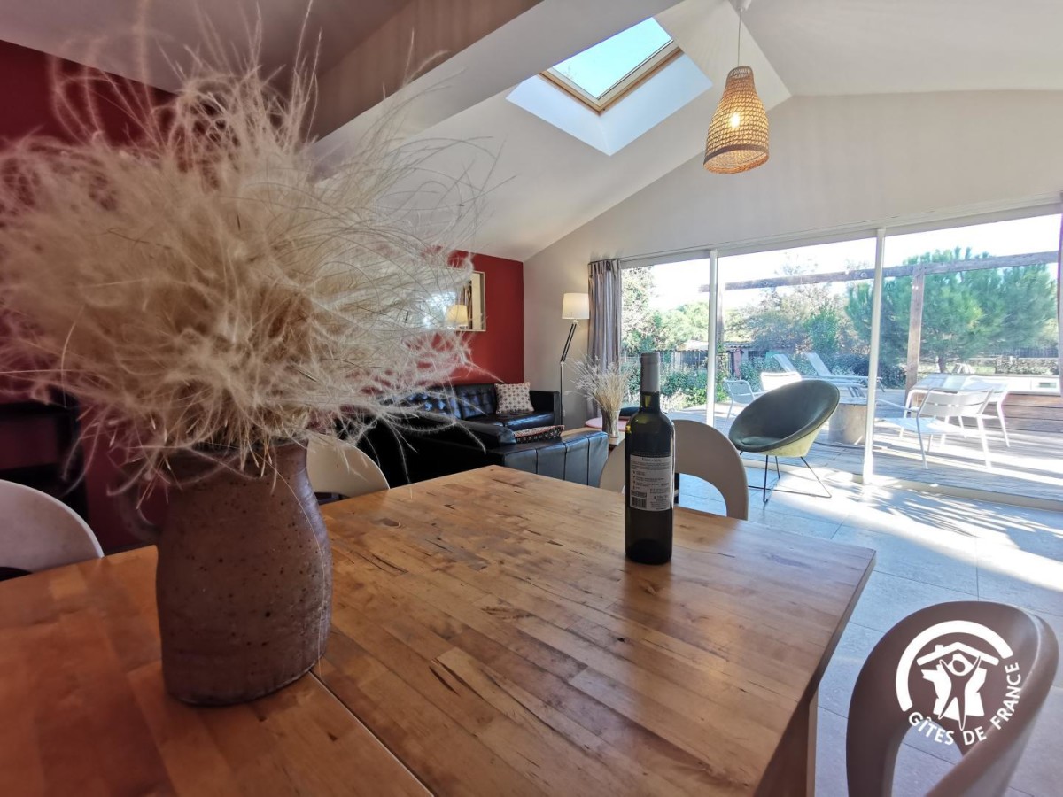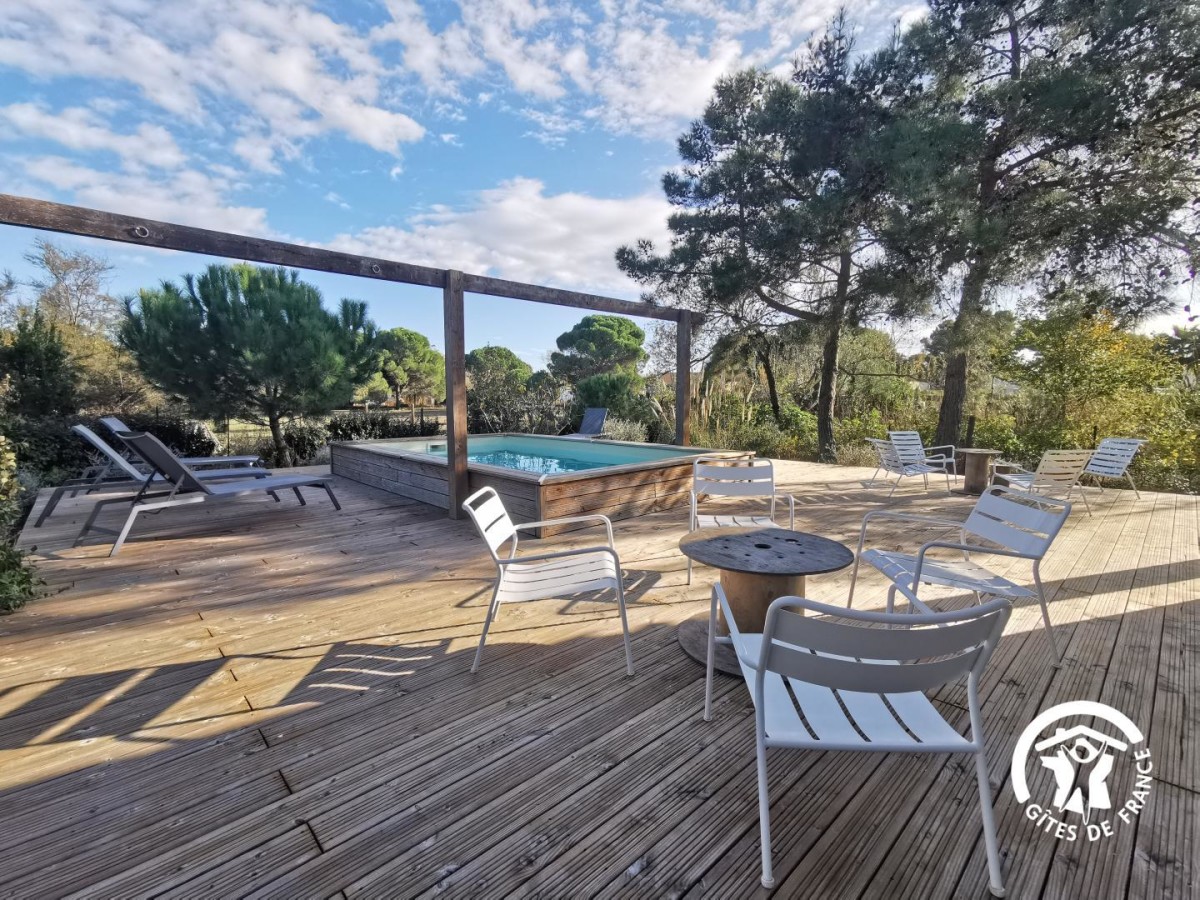 À l’extérieur, vous profitez d’un jardin clos et entièrement privatif avec une grande terrasse en bois, couverte, aménagée avec chaises longues et salon de jardin pour prolonger les soirées d’été. La piscine privative extérieure, avec vue dégagée sur la nature promet de belles journées de détente.