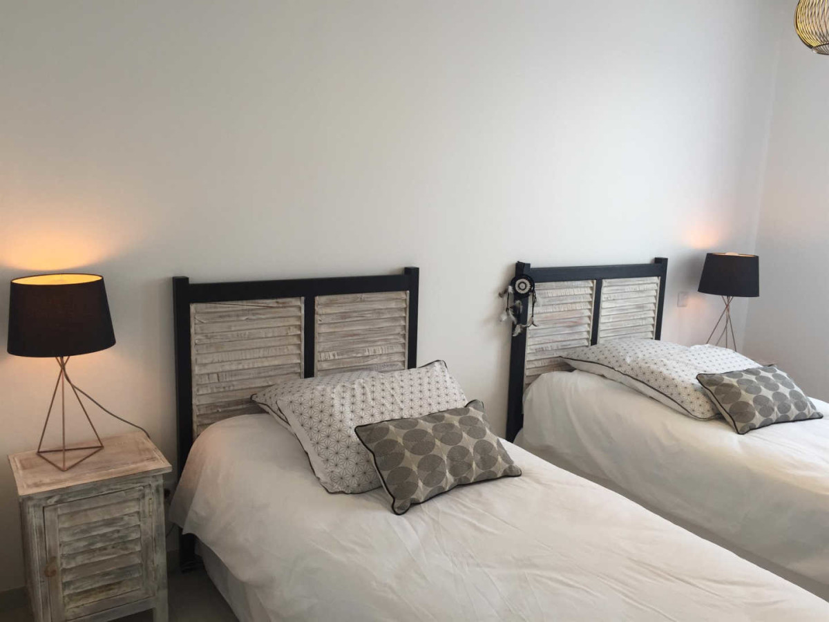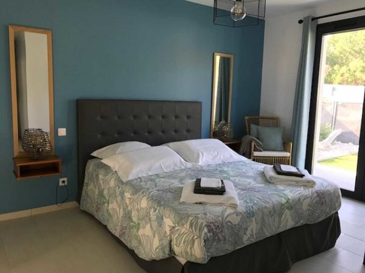 Accès direct sur la piscine sécurisée chauffée de juin à octobre. 2 chambres comprenant chacune 2 lits 90X200 modulables en lit 180X200, 3ème chambre avec salle d’eau/wc privatifs équipée d’un lit 160X200. 2ème salle d’eau indépendante, wc. Chauffage électrique inclus, wifi, climatisation, matériel bébé, lits faits à l’arrivée et linge de toilette fourni, ménage fin de séjour inclus, caution de 1000€. Salon de jardin, barbecue, parking.