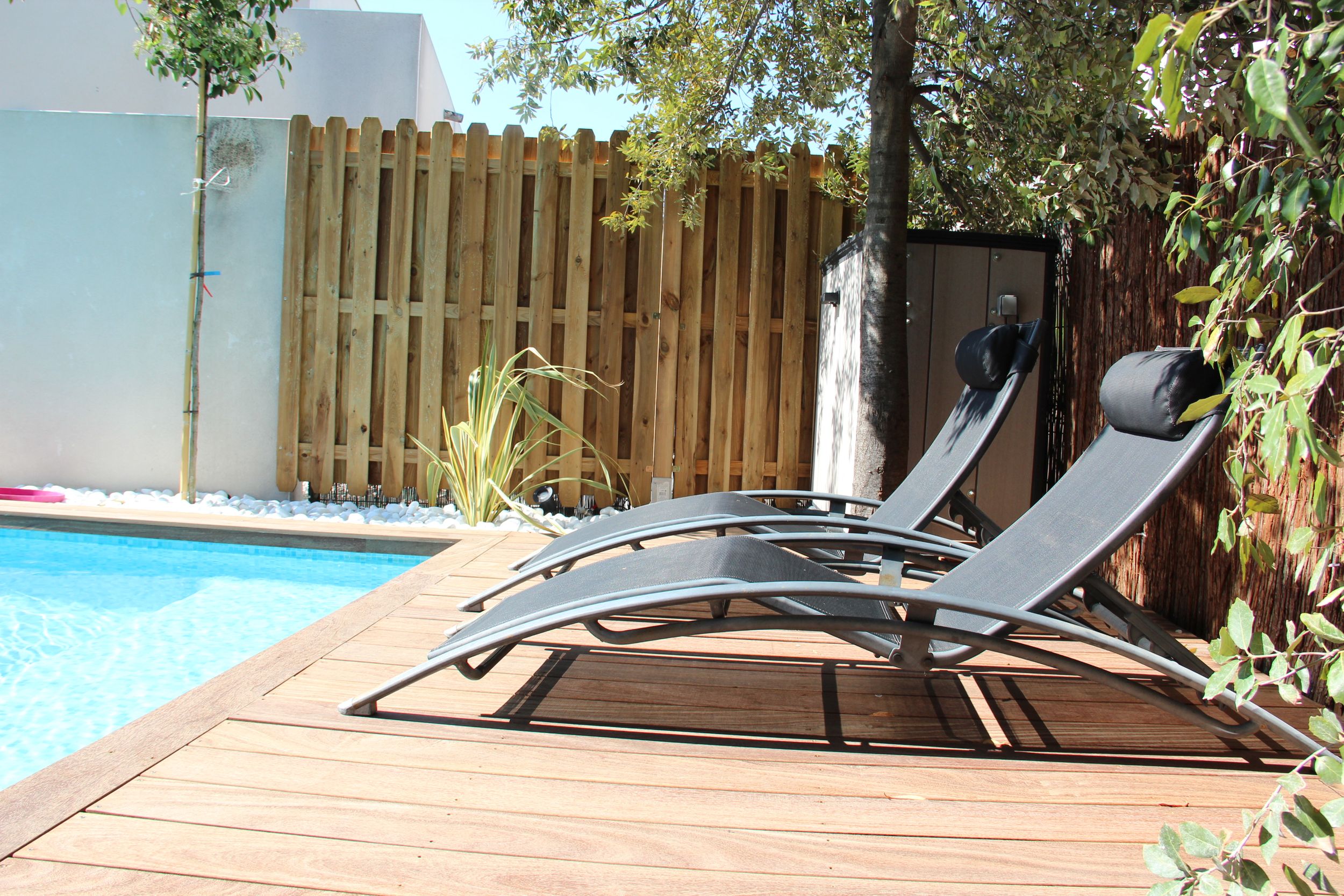•Piscine en béton carrelée en pâte de verre, entourée de plages en teck, avec large banc immergé adapté aux enfants