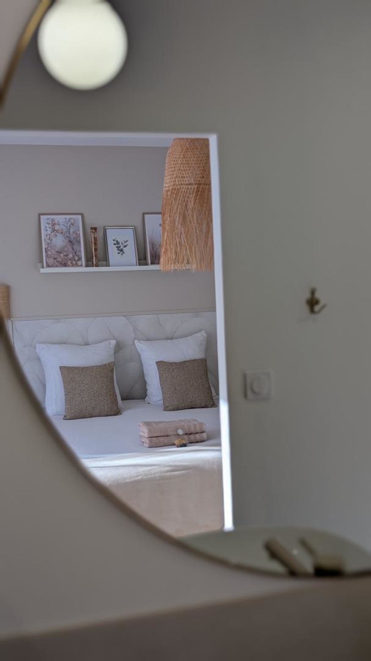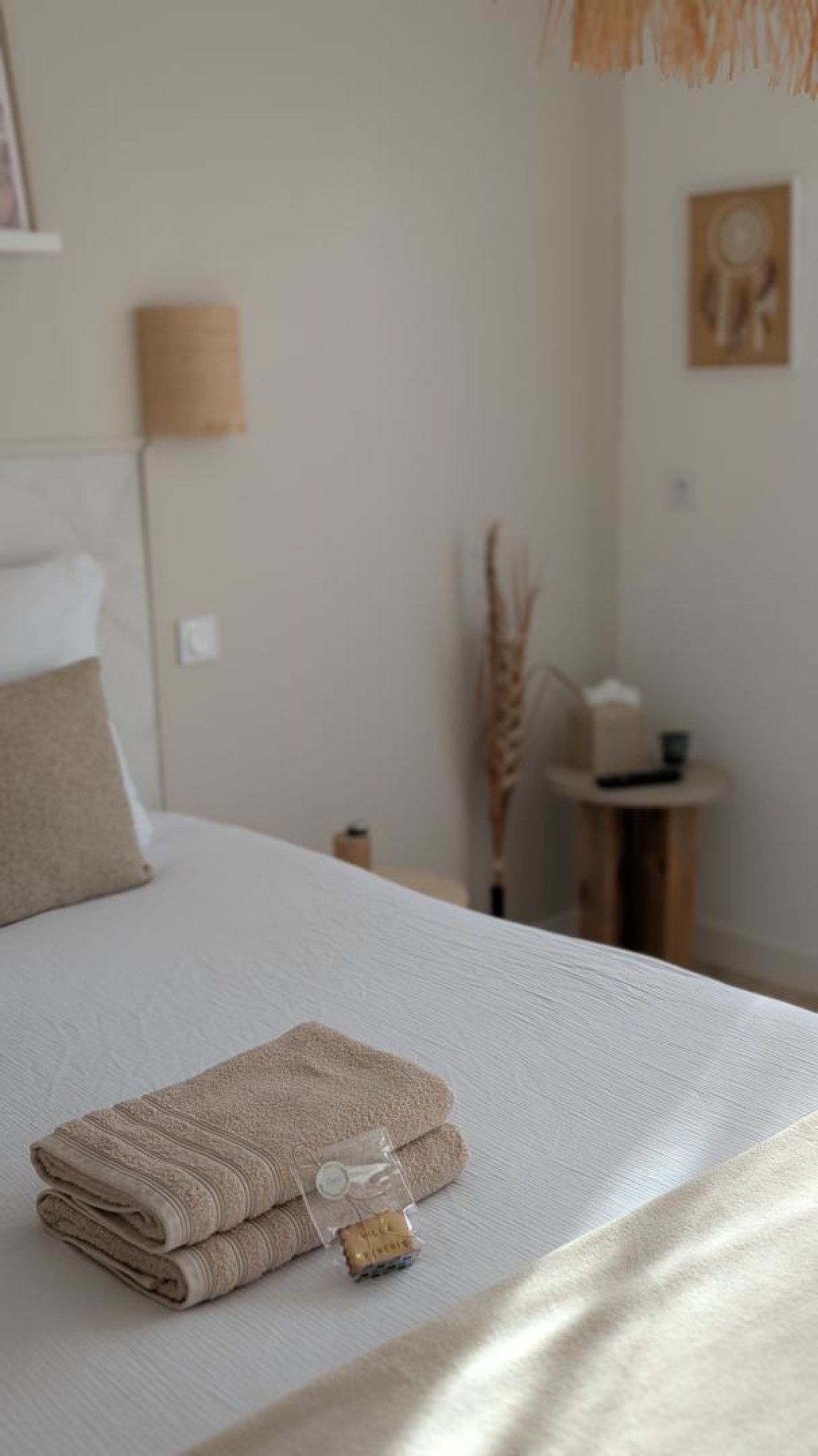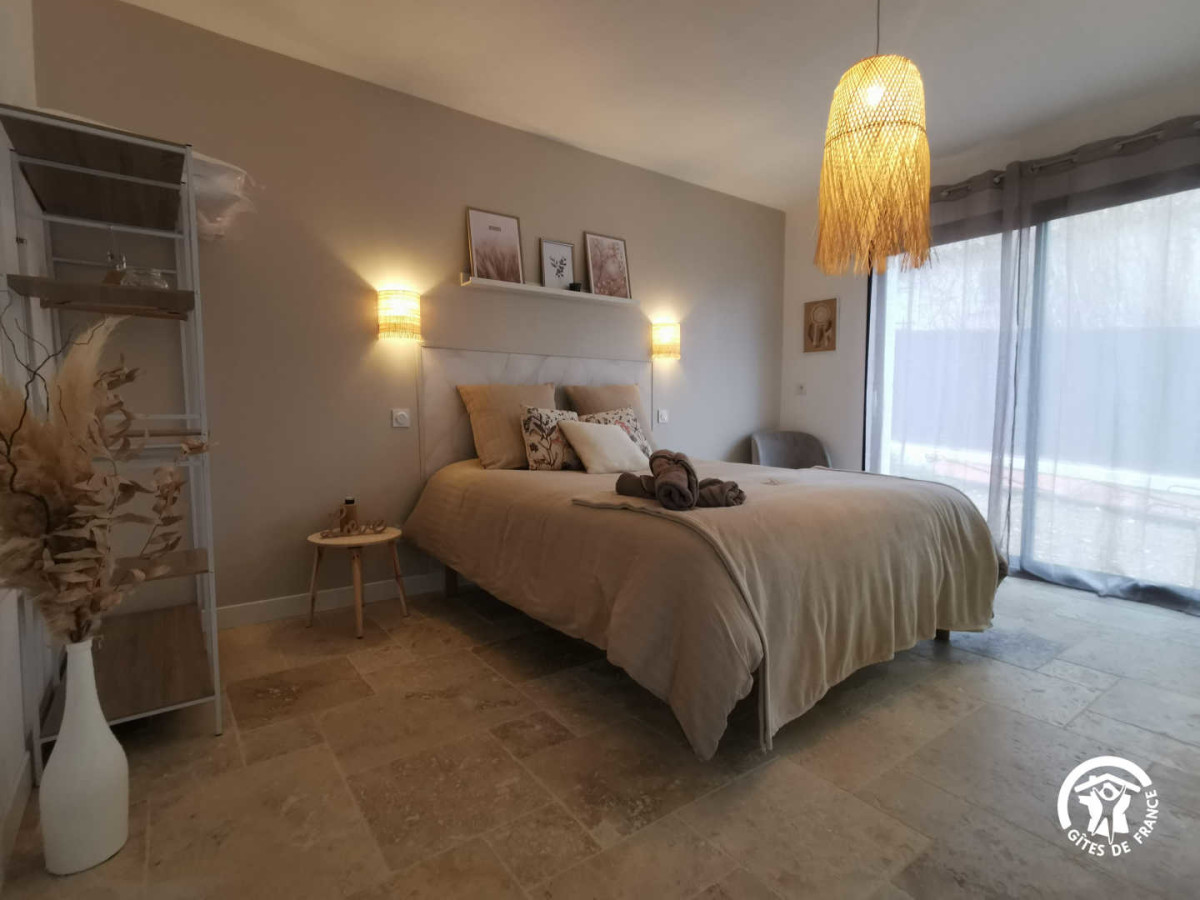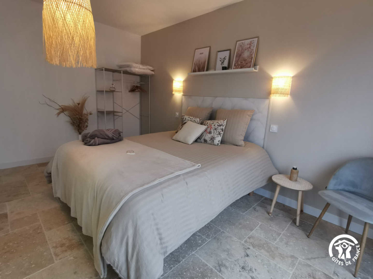 Grâce à ses couleurs douces et neutres avec des notes de sable, crème, blanc et pierre dans une atmosphère de douceur et de cocooning, la literie est haut de gamme, de marque française avec son lit queen size, sa salle de bain ouverte sur la chambre avec une grande douche, son plan vasque béton ciré et son wc. Baignée de lumière, elle peut très bien convenir pour des séjours romantiques, ou pour des jeunes mariés le soir de leur mariage ou en voyage de noces. (option uniquement sur demande et en surplus, voire l’onglet « nos services »).