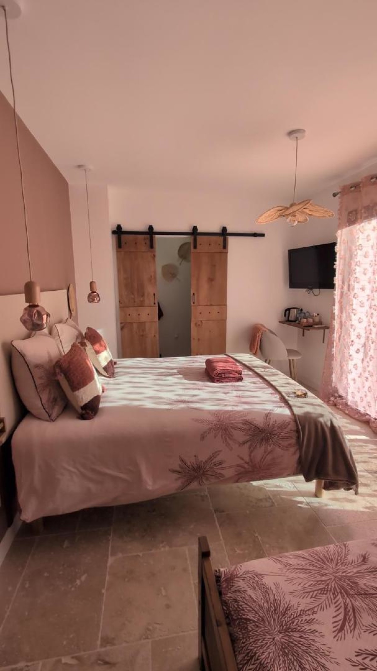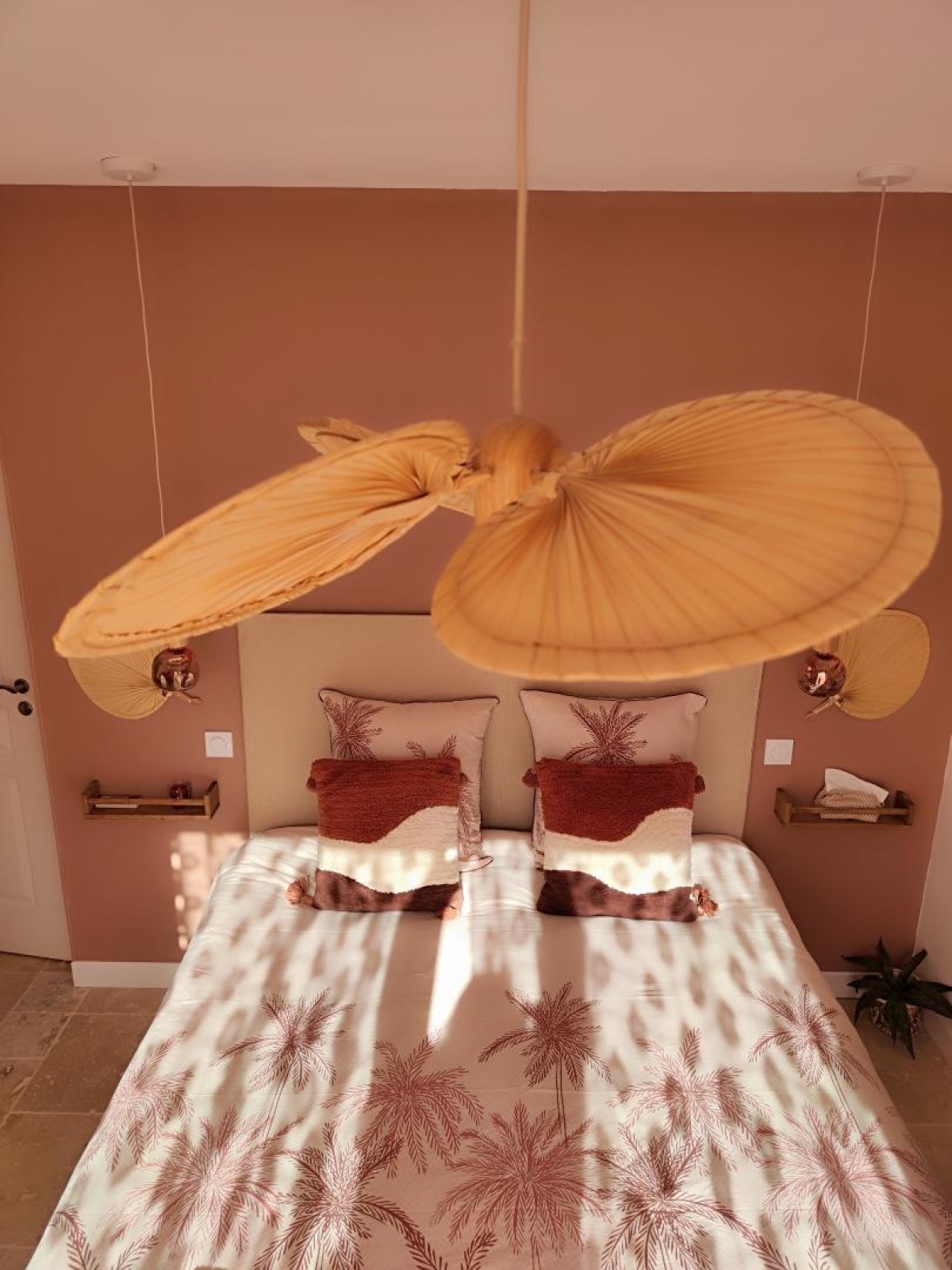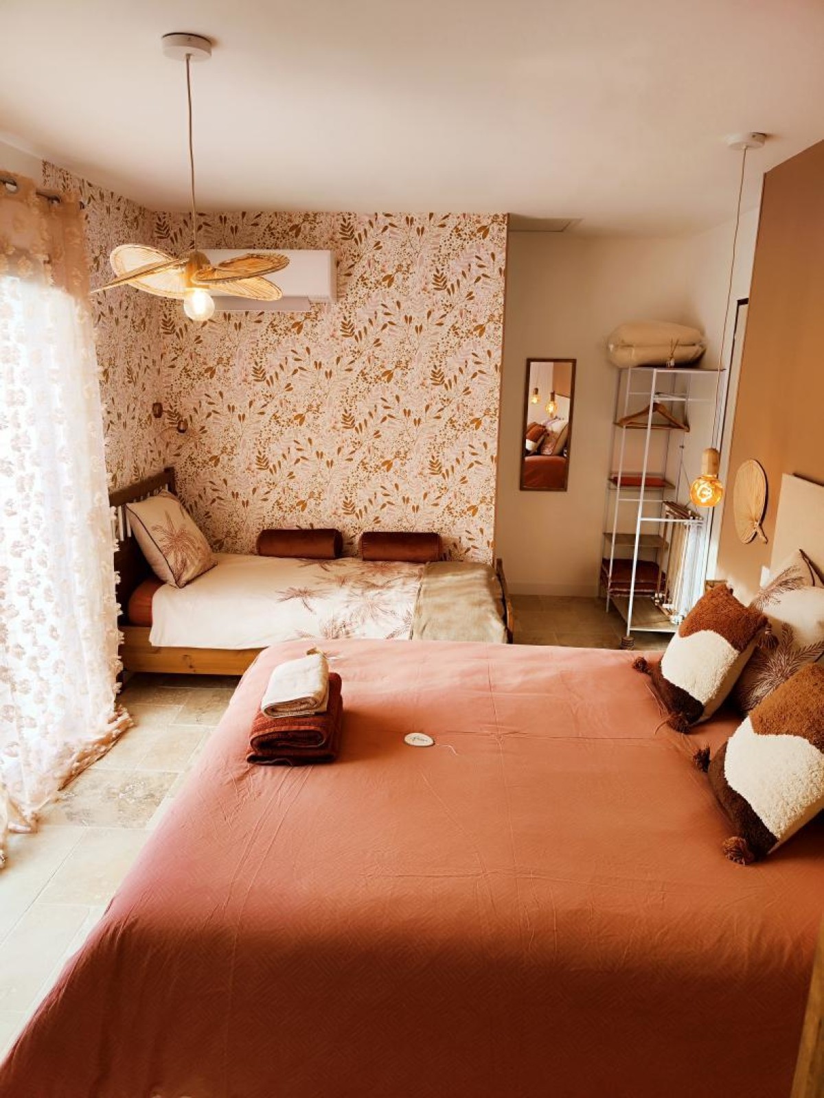 Cette chambre aux couleurs chaudes tel que le terracota et le cuivré peut, comme son nom l’indique par le choix de la déesse VESTA « déesse de la famille « , accueillir jusqu’à 3 personnes avec son lit queen size de 160cm, un lit supplémentaire en 90cm, une salle de bain avec sa douche italienne, un meuble simple vasque et son wc séparé.