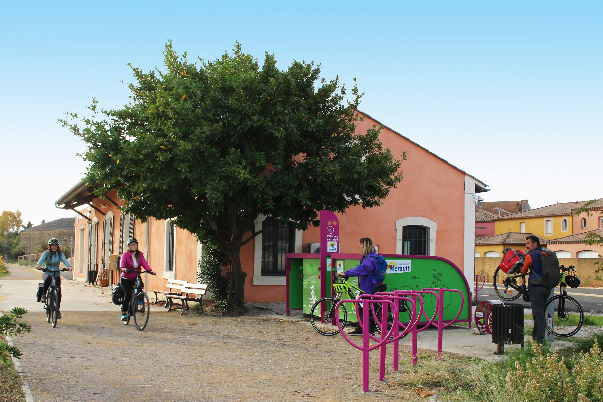 En arrivant à Cazouls, vous longerez l’ancienne gare avant de poursuivre tranquillement votre parcours. À la fin de cette portion de voie verte, prenez à droite pour redescendre vers Maureilhan. À quelques mètres, vous trouverez du matériel d’entretien pour les vélos. Un point de vigilance toutefois : la sortie du village emprunte une piste bordée de fossés bétonnés non protégés avec également une descente caillouteuse en dévers et en pente qui ne sera pas accessible à tous les usagers. Cette configuration peut présenter un risque pour les personnes dépendantes ou pour les enfants dont la vigilance n’est pas constante. Une attention accrue permet de traverser ce secteur en toute sérénité. - 5 De Maureilhan à Etang asséché de Montady