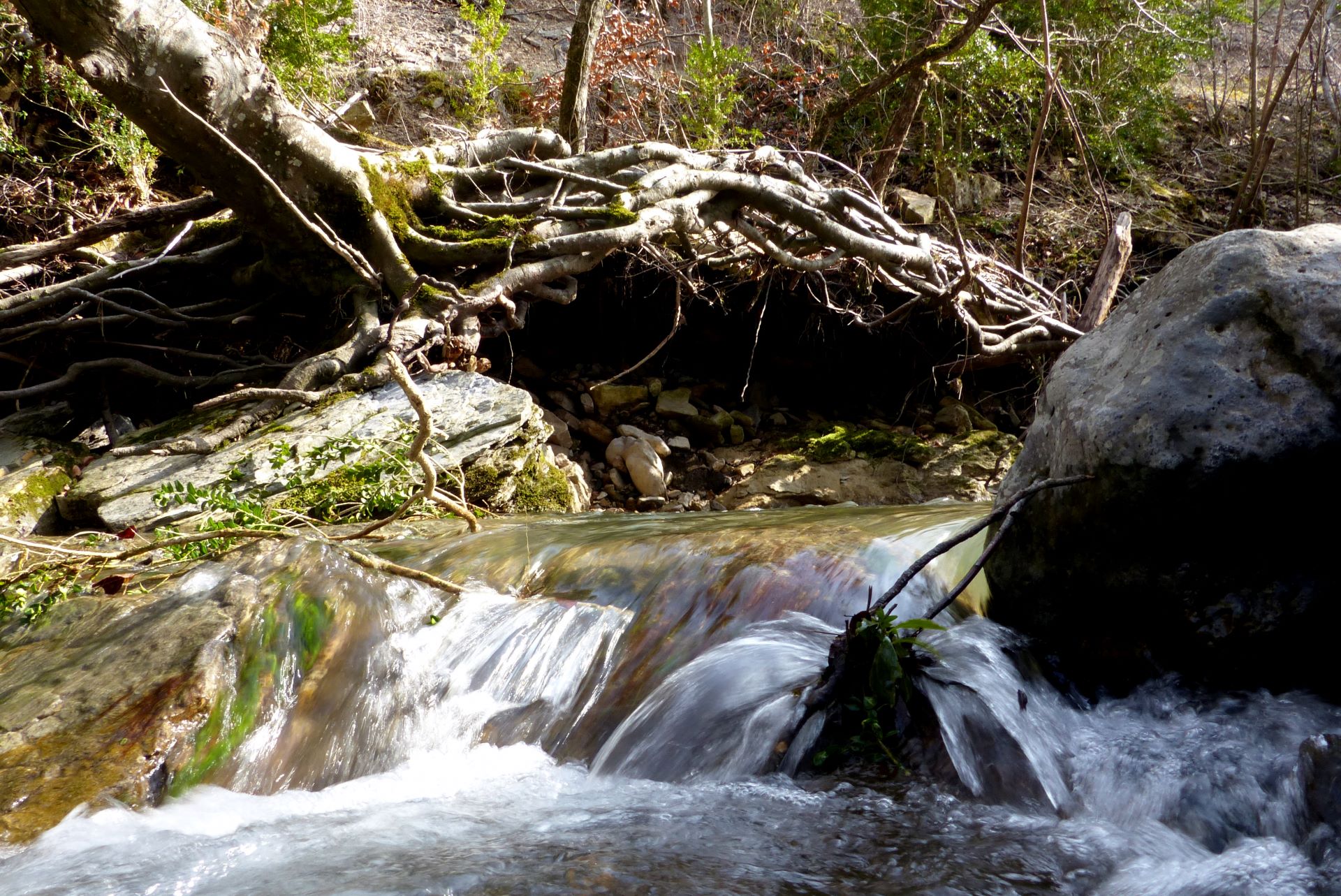 Quitter cette piste à gauche par un sentier qui s’enfonce dans une végétation de buis, de pins et de hêtres (observer la présence au sol de bornes AF (Administration Forestière). Poursuivre à travers une végétation variée et un terrain dolomitique accidenté par endroits (bien suivre le balisage). Amorcer une descente dans un massif végétal et rocailleux recouvert de mousse et rejoindre un ruisseau intermittent. Continuer à travers une zone plus dégagée pour atteindre la Lergue ; franchir le ruisseau. - 9 9