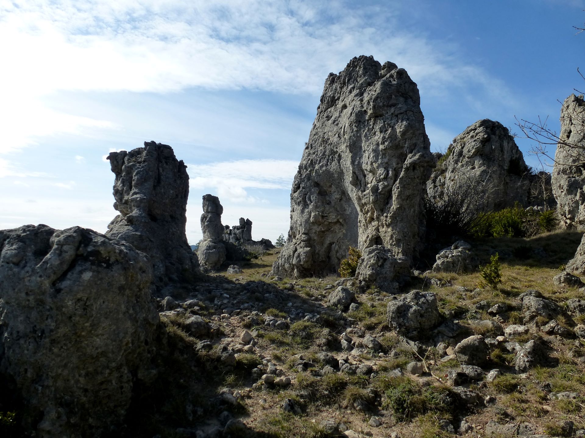 Quitter la piste et s’engager à droite dans la forêt, sur un sentier (prudence : bien suivre le balisage). Plus loin, traverser des rochers déchiquetés et atteindre un carrefour en « T » (à gauche : accès à Camp Rouch). - 9 De Chaos dolomitique à Descente vers Pégairolles